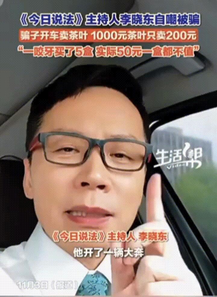 原来这个天天宣传反电诈、反诈骗的名人也躲不过被骗啊[尬笑][尬笑]。《今日说法》栏目主持人李晓东发视频说,他1000块钱买了5盒实际一盒连50块钱都不值的茶叶。 李晓东说卖茶叶的人说是到北京开茶叶展销会的,茶叶带不回去了,原价1000块钱一盒,200块钱一盒卖给他,然后他就买了5盒,然后第二天李晓东找了一位业界懂茶叶的朋友长长眼,然后得出的结论是:添了香精的的伪劣茶叶,50块钱一盒都不值。[笑哭] 果然骗子是防不胜防,有网友说之所以没被骗过只因为没遇见适合自己的剧本,不过时刻谨记贪便宜的心理不要有,应该能大大降低被骗的几率
