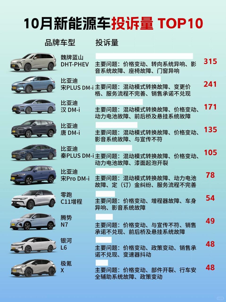 看了10月投诉榜,再聊聊我的零跑C11 刷到这个榜心里咯噔一下,好家伙,几乎全是“价格变动”…这点我得站零跑,虽然也背刺老车主,但起码它上市定价就实在,没给我虚高再猛降的预期。 仔细看,好多问题都出在复杂的混动系统和车机上。这么一比,C11的前双叉臂悬挂底盘优势就出来了——结构简单可靠,过坎干脆,就是稳当。再加上它增程式,没那么多模式转换的烦恼,结构相对简单,故障点自然也少。 这年头买车像开盲盒,我更愿意把钱花在空间、底盘这种“硬骨头”上,而不是为那些花里胡哨但容易卡顿死机的功能买单。C11这点就挺实诚,还要啥自行车?开了这么久,它就是我一个靠谱的“移动小家”,省心,就够了。【来自懂车帝车友圈】