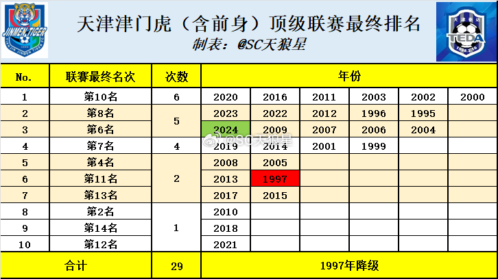 7. 今年津门虎的联赛最终排名,将在第6名-第8名的区间内。职业化以来,我们在顶级联赛拿过5次第6、4次第7、5次第8。(图6)