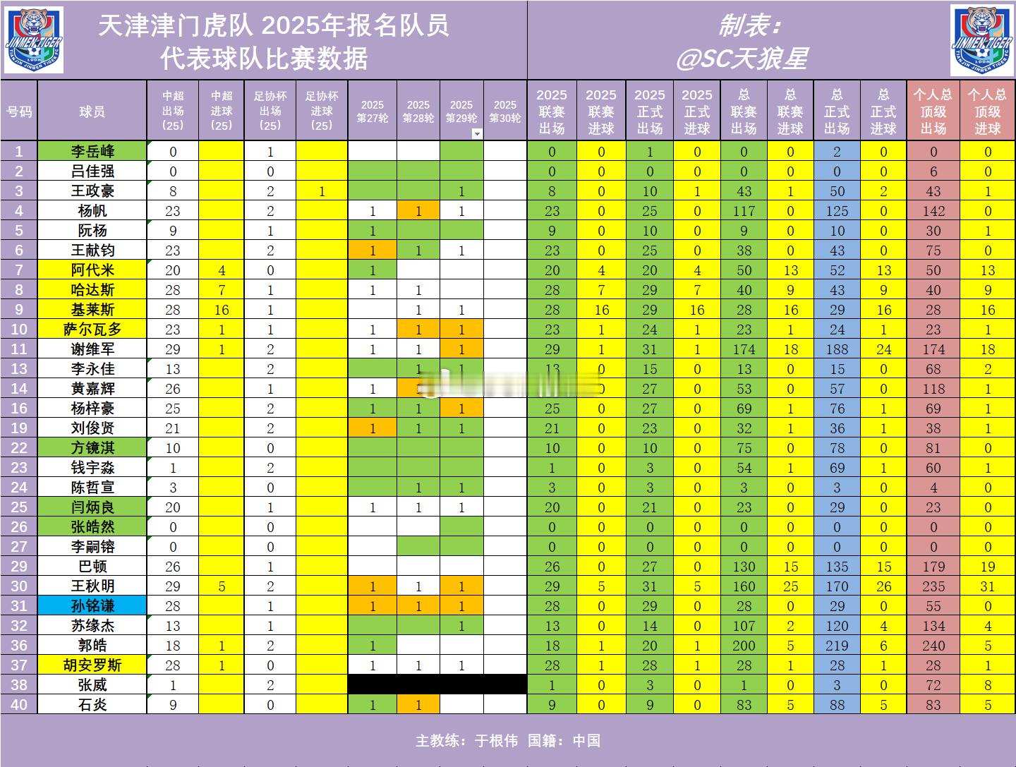 天津津门虎 2025中超 第29轮(1:2山东)赛后数据: