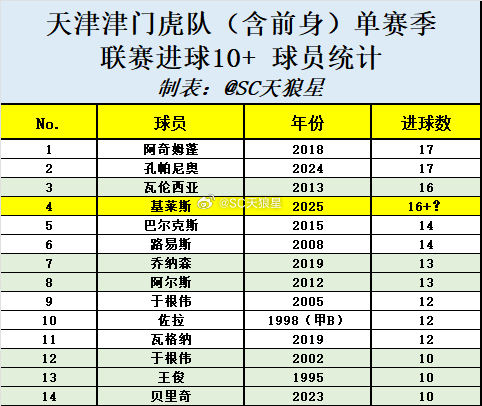 5. 基莱斯今年联赛已打入16球,距离球队单赛季联赛进球纪录,还差1球。(图4)