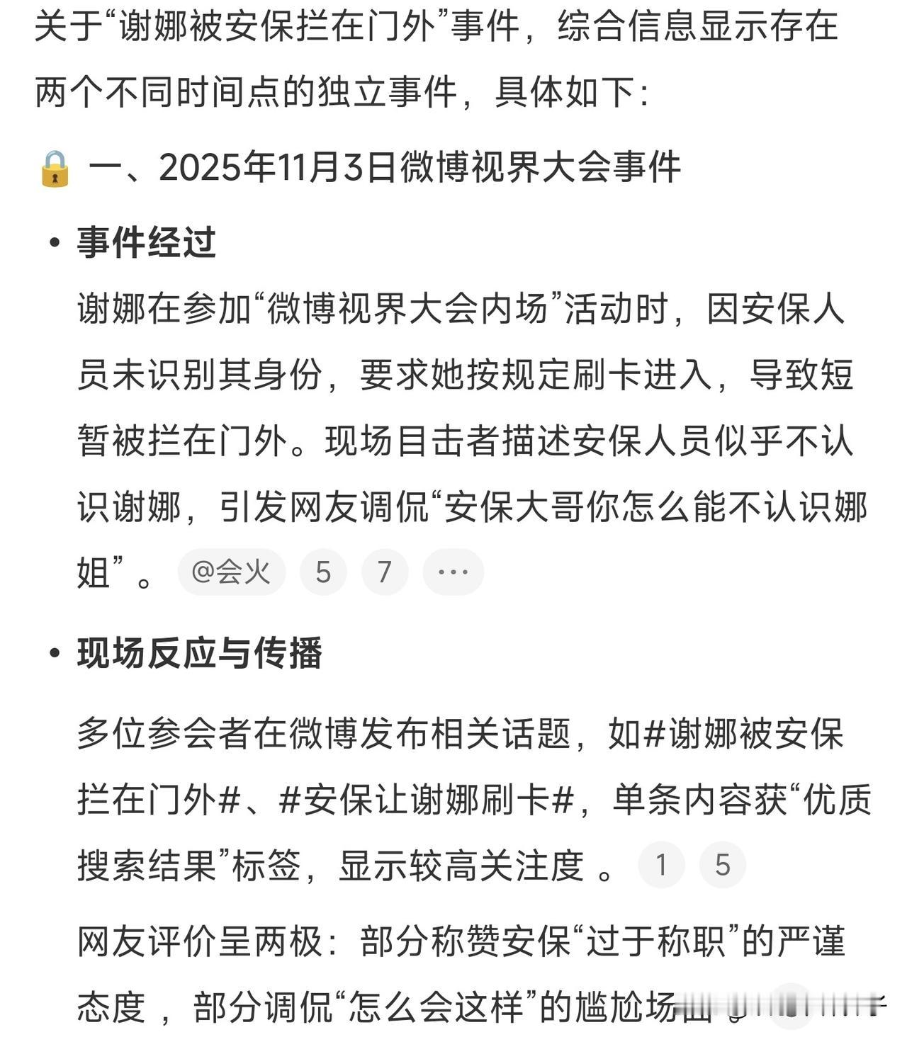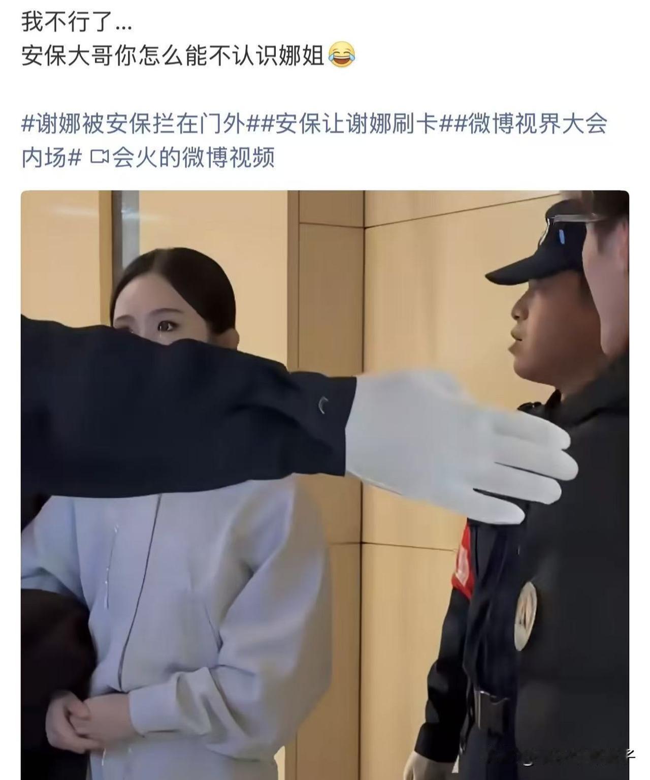 尴尬了!谢娜出席活动被保安拦在门外…… 11月3日,视界大会红毯环节,众多明星纷纷到场,谢娜装扮的非常漂亮,给观众带来一场视听盛宴。 然而,网上晒出一段视频,谢娜在参加内场活动时,却出现一点小插曲,据说是忘记带门卡,保安要求按规定进入,由于不认识娜姐,直接将其拦在门外。 不过,视频中声音很小,听不太清楚,到底什么情况,不得而知。 如果真如网上所描述,虽然有点尴尬,谢娜也不必在意,保安也是职责所在,这样的做法,非常敬业,值得夸赞。 另外,作为公众人物,更应该遵守规定,做出好榜样。