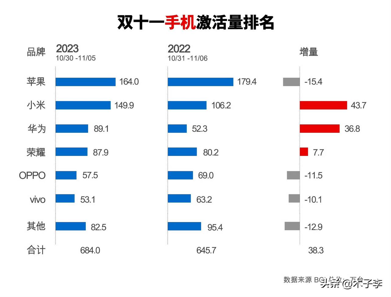 根据BCI的数据,相比去年,今年双十一手机激活量,在总激活量增加了近40万台的前提下,苹果手机减少了15.4万台,小米增加了43.7万台,华为增加了36.8万台,荣耀增加7.7万台。 国产手机特别是国产高端手机崛起,让苹果越来越不如以前受欢迎。苹果双11 双11苹果手机 双11销量