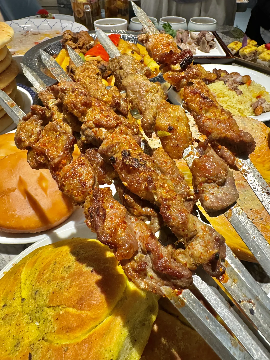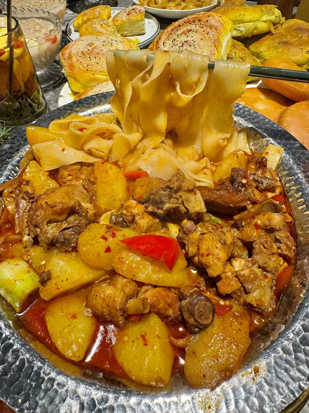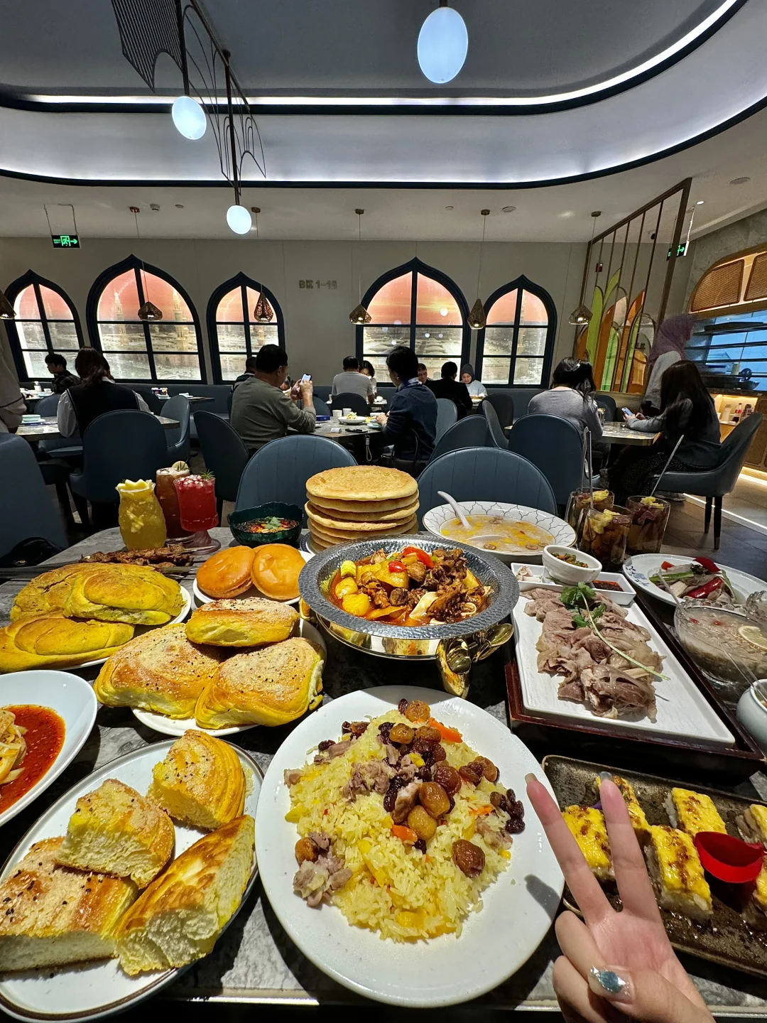 好吃已经夸累了!!很地道的一家新疆菜!! 新疆手抓饭真的绝!!米饭粒粒分明,每一粒都包裹了羊肉的油脂香!羊肉细嫩不会油腻!! 羊肉串没膻味!肉质鲜嫩多汁~ 大盘鸡皮带面!鸡肉鲜嫩麻辣鲜香,还有软糯的士豆,和裹满汤汁的皮带面!入口真的好满足!! 还有各种口味的馕,好吃滴很~