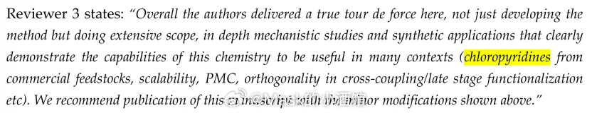 "氯代吡啶"是农药和药物工业的基础原料,全球每年用量数以万吨计。审稿人特别提到:"从商业原料直接制备氯代吡啶",这对产业链的冲击可想而知。