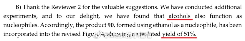 还有位审稿人问了个细节问题:反应过程中产生的水会不会捣乱?作者回答说确实有微量影响,但问题不大。审稿人又建议试试酒精行不行,作者一试,还真行,收率51%。