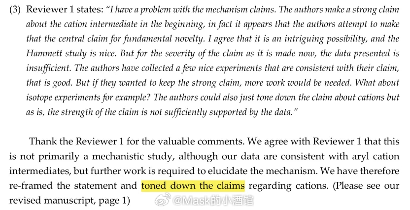 有位审稿人质疑论文里关于反应机理的说法,觉得证据不够充分,建议要么补实验,要么把话说得温和点。