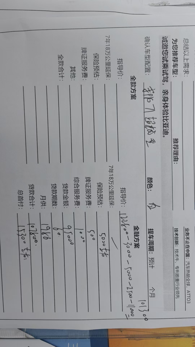 宋pro dmi71公里超越版落地 因为有辆06年的老捷达可以申请这次国补,加上刚换工作离家比较远,日常工作也经常需要出行,赶上补贴就计划买个车。 因为没时间去逛,都是网上了解价格,抖音里一个比一个便宜,全国可提,想提却联系不上哪里提车就离谱。 一开始想买个帝豪或者秦plus追求极致性价比,最终因为油车补贴少5000元,落地还要加上购置税6000多元,转而考虑混动,秦电话上本地问了,福州也问了,一毛没便宜,加上网约车化,就考虑新出的秦L,9.98万,新车一样没优惠。 一看宋pro要换代应该可谈优惠,suv空间也大,家用更合适,价格优惠下来也差不多,最终谈11.3万落地,有点仓促,店里家人去看过一次,谈了就放了定金,后面我电话沟通最终销售算来算去是这个价了。心理好价是11万,毕竟5个月的库存车。价格给大家做参考,坐标福莆田。附销售最终落地报价单。