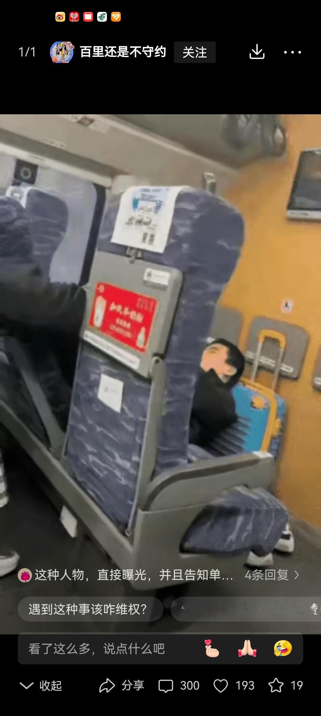高铁上惊现令人恶心的一幕! 最近有乘客曝光了一段在高铁上拍摄的视频,说的是一男子不知啥原因有座位不正常坐,偏偏把背靠在行李上,然后把脱了鞋子的臭脚伸到对面的乘员区。 邻座男子明明有座不坐,偏把后背抵着行李架,裤脚一撩,就把双脚伸到了对面姑娘的桌前。 那脚不知多久没洗,酸臭味隔着口罩都钻鼻子。姑娘攥着衣角,眉头拧成疙瘩,捏着鼻子往后缩,却没敢说一句话。 周围乘客要么扭头装没看见,要么掏出手机默默拍视频,车厢里只剩高铁的轰隆声,和那股挥之不去的异味。 终于有位大哥忍无可忍,起身找了列车长。面对质问,男子还嘴硬:“我脚酸,伸伸怎么了?” 列车长勒令他把脚收回,又说了几句规矩,男子才不情不愿地放下裤腿,脸上还带着不服气。 网友说得好:公共空间不是自家炕头,你的舒服,不能建立在别人的难受上。 没教养的人,走到哪都让人膈应。要是你遇上这种事,会当场怼回去,还是找工作人员?