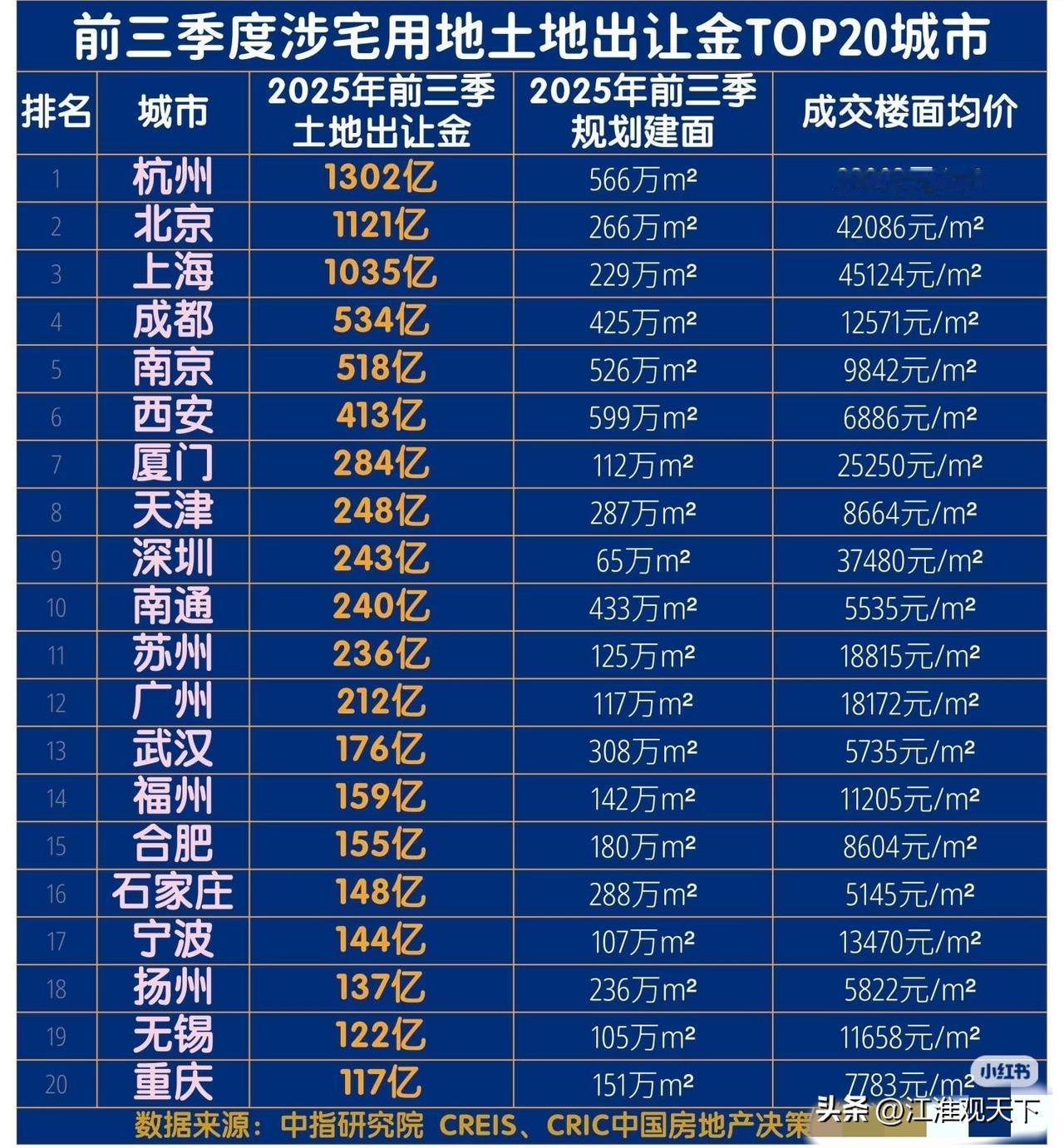 中国房子依然还值钱的20个城市,杭州土地出让金排名第一 房子降价了,不值钱了?这个言论,确实这几年在网络上比较多,对于中小城市来说,人口流失,经济大环境差,房价下跌,是客观存在的事实,但是对于超大城市,特大城市来说,房子依然还是很保值,还是有房产企业在购地建房。 2025年前三季度,涉宅土地出让金前20名城市,分别是:杭州,北京,上海,成都,南京,西安,厦门,天津,深圳,南通,苏州,广州,武汉,福州,合肥,石家庄,宁波,扬州,无锡,重庆。房产价值分析 房产性价比分析 房产价值 杭州新房 杭州房价陷阱 杭州楼盘跌幅榜 房产价值重估