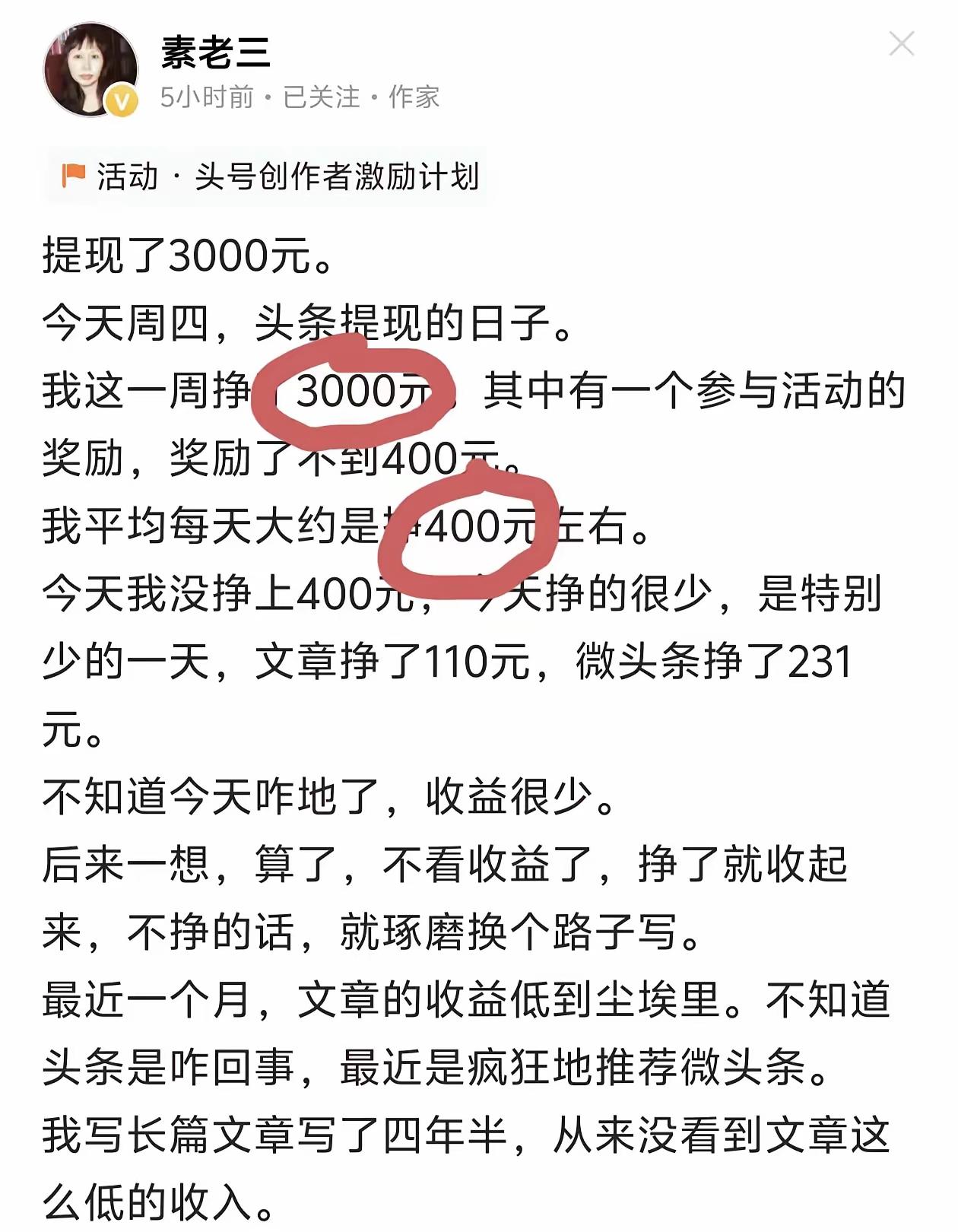 周四素老三又提现3000元子,好羡慕[泪奔] 人家平均每天都有400元,这比大部分打工人强的太多了,而且也说出来我同样的想法,为什么最近的文章收益会这么低?而且流量也少的可怜,压根就不推流,还是乖乖写微头条吧素老三 素老三收益 素老三文学 素老三文案 素老三玩法 素老三争议 素老三推荐书单