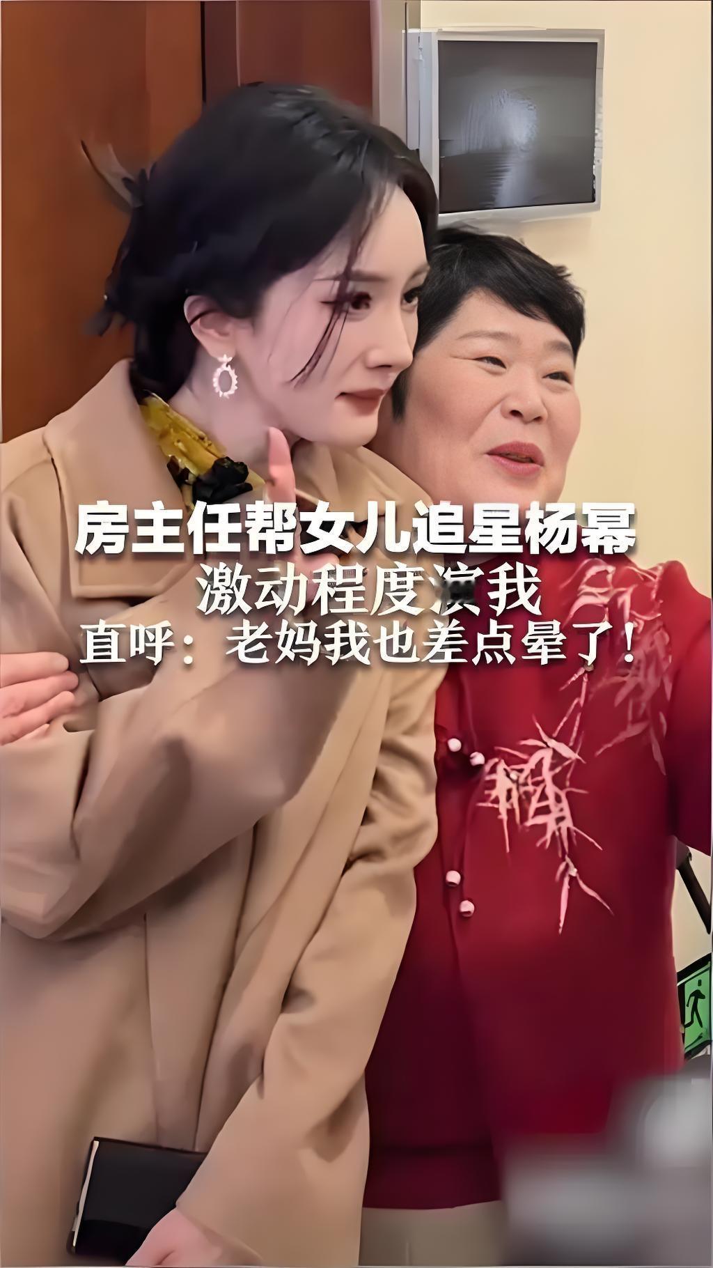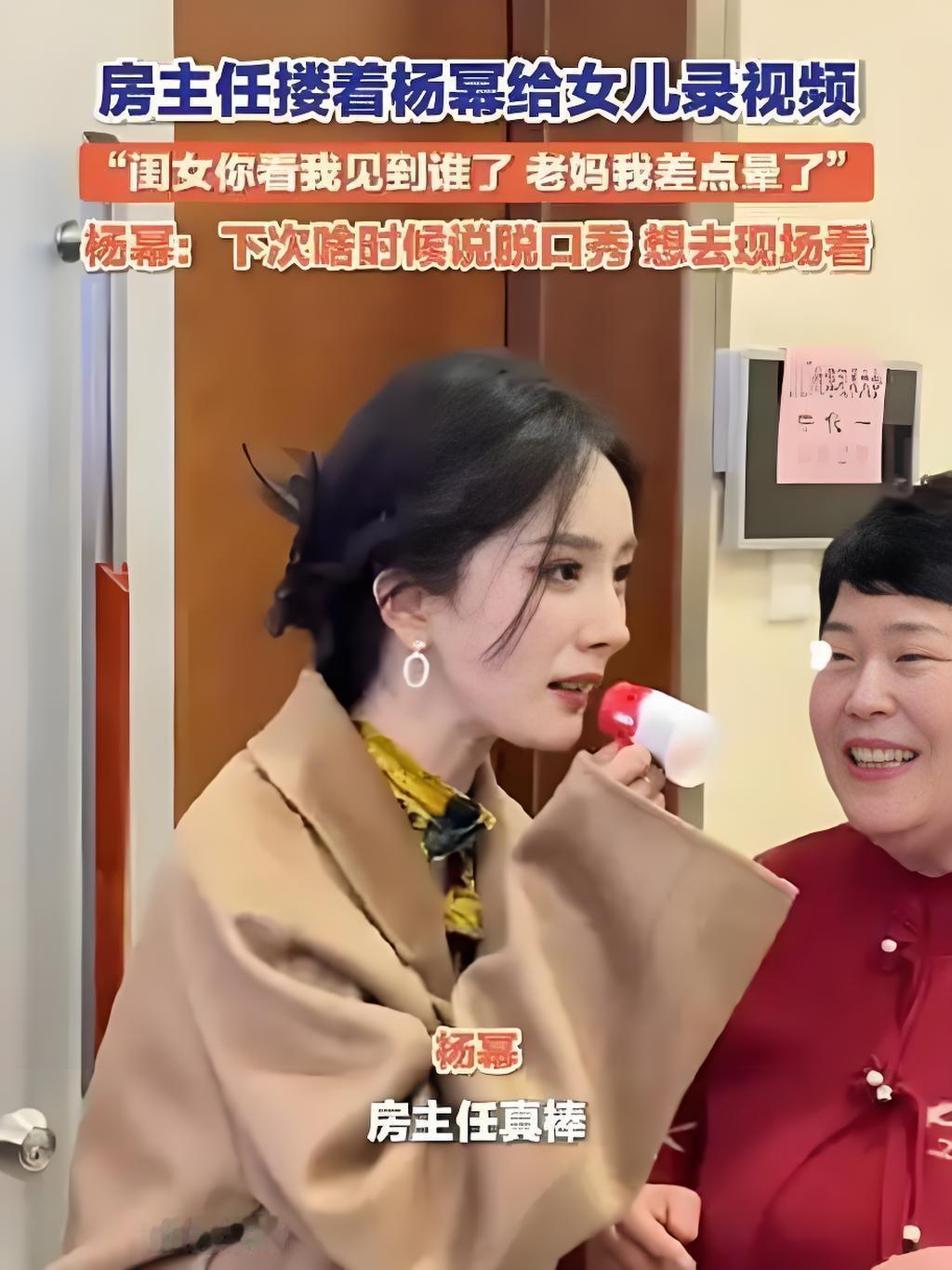 11月3日微博视界大会后台,脱口秀演员房主任搂着杨幂为女儿录追星视频,兴奋大喊:“闺女你看这是谁!”杨幂全程配合,还俏皮询问脱口秀演出时间。房主任事后发文称杨幂“本人太美,差点晕过去”,圆了女儿初中追《宫》的偶像梦。杨幂名场面 杨幂舞台造型 杨幂情感 杨幂控场
