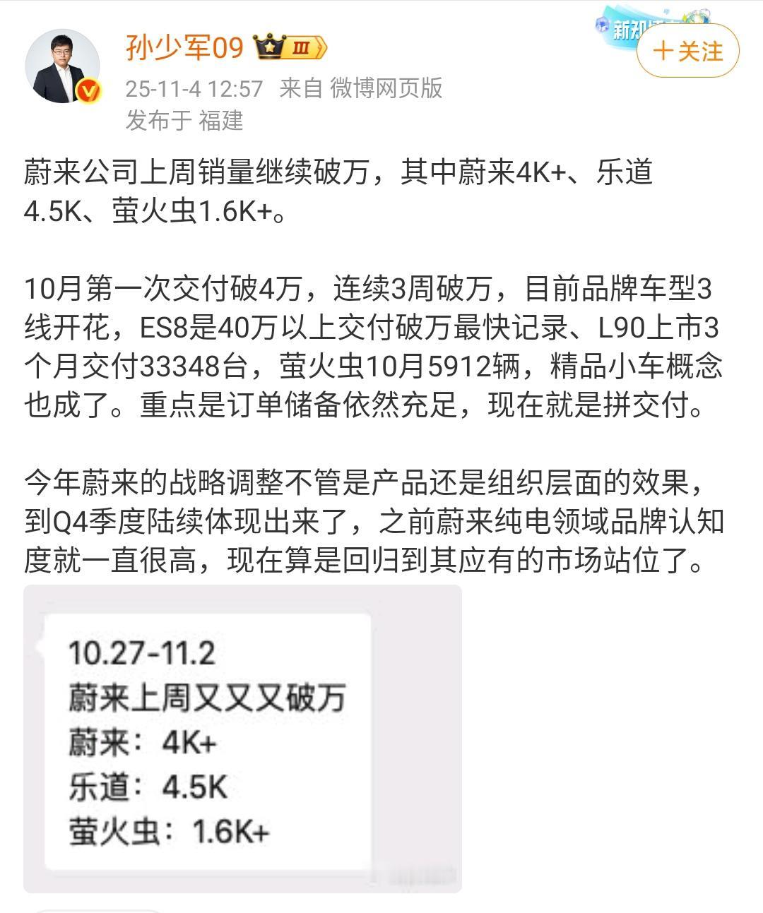 蔚来公司上周销量继续破万,其中蔚来4K+、乐道4.5K、萤火虫1.6K+! 真是风水轮流转,现在终于转到蔚来身上去了。此前蔚来不好卖,并不是说车型不行,而是大家都觉得太贵了,凭什么一个换电的车型多了,换电功能要比其他品牌贵这么多。 现在价格比同类的车型还低,蔚来的优势就被放大了,特别是新推出来的三款车卖的都挺不错的。