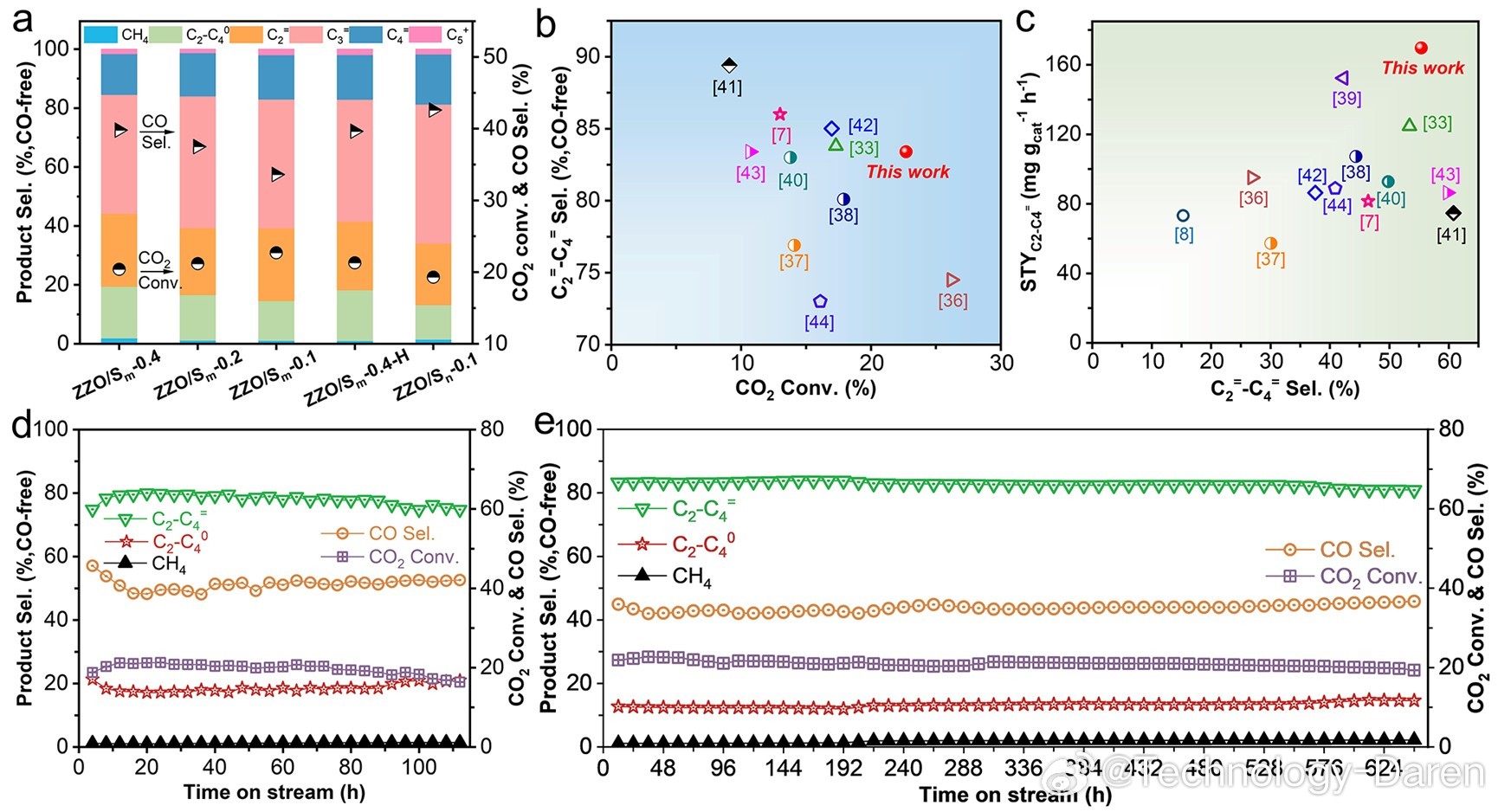 [看涨]团队借助原位表征技术与理论计算研究手段,揭示了CO2与H2经由甲醇中间体转化为低碳烯烃的反应路径,这一反应机理解释了产物中丙烯选择性较高的现象。同时,等级孔SAPO-34分子筛展现出多功能催化应用潜力,可高效转化合成气、富CO2合成气、CO/CO2/H2宽范围比例的混合气,以及甲醇制备低碳烯烃。这一环境友好的合成策略,可简便、低成本、大规模地制备出具有长周期反应稳定性的等级孔SAPO-34,克服了等级孔SAPO-34在实际应用中面临的关键瓶颈。