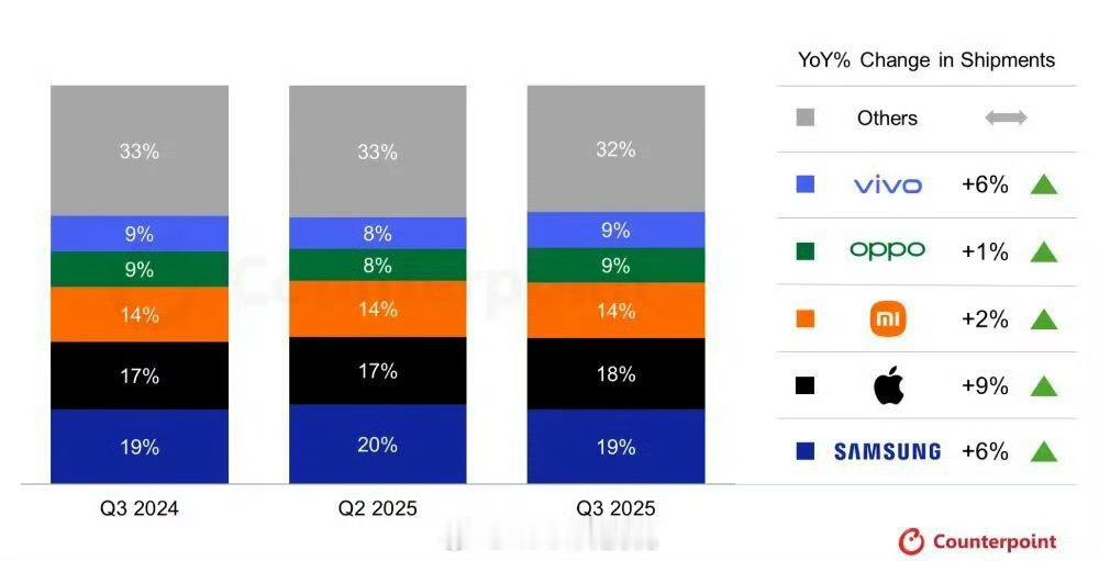三季度全球手机销量,前三依然是三星 苹果 小米