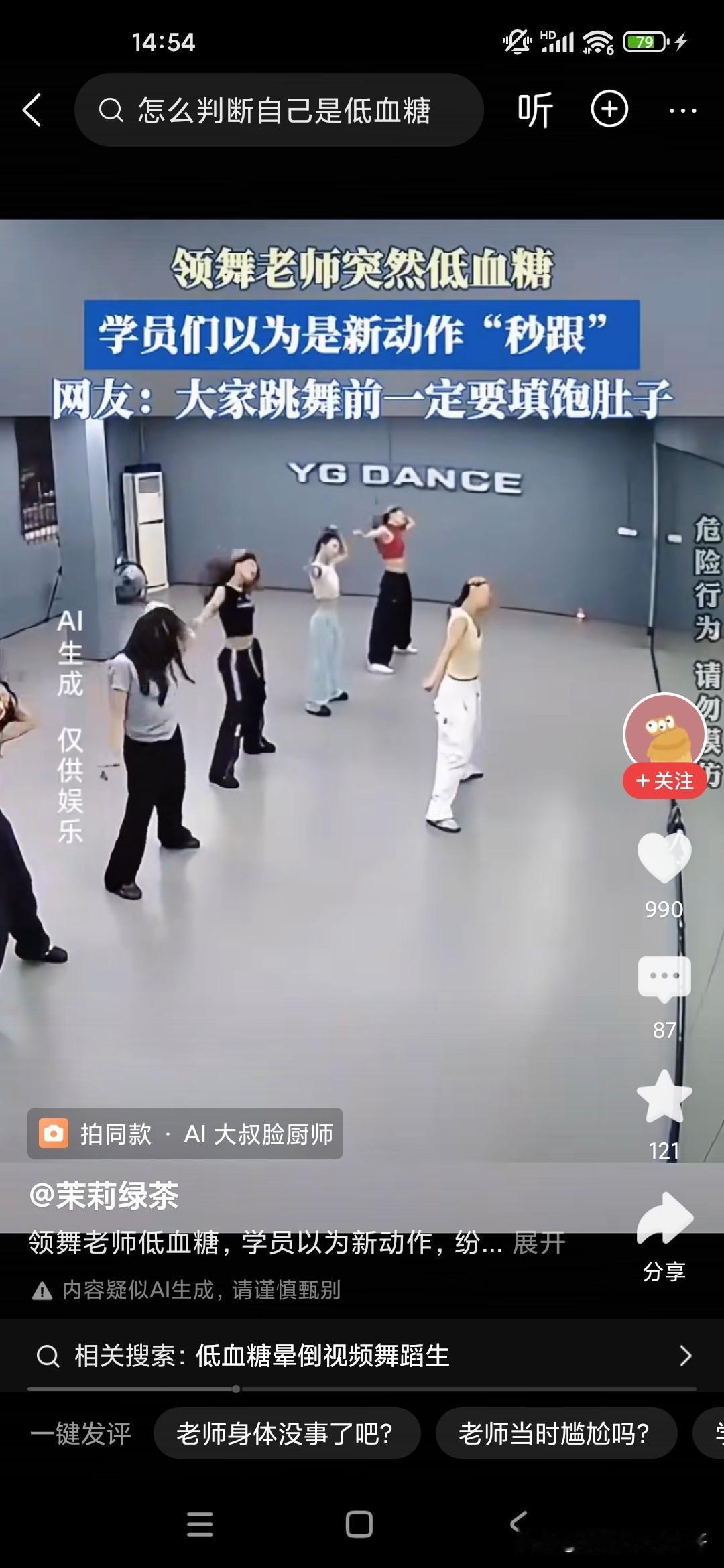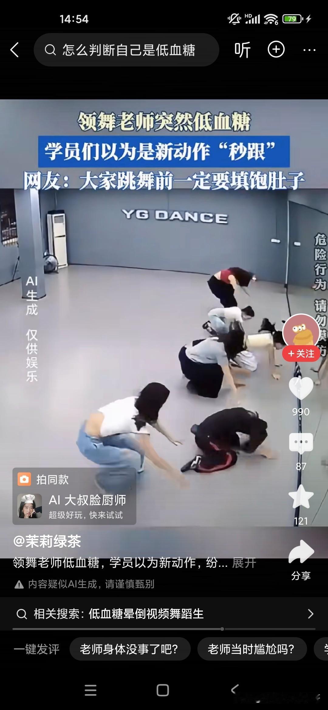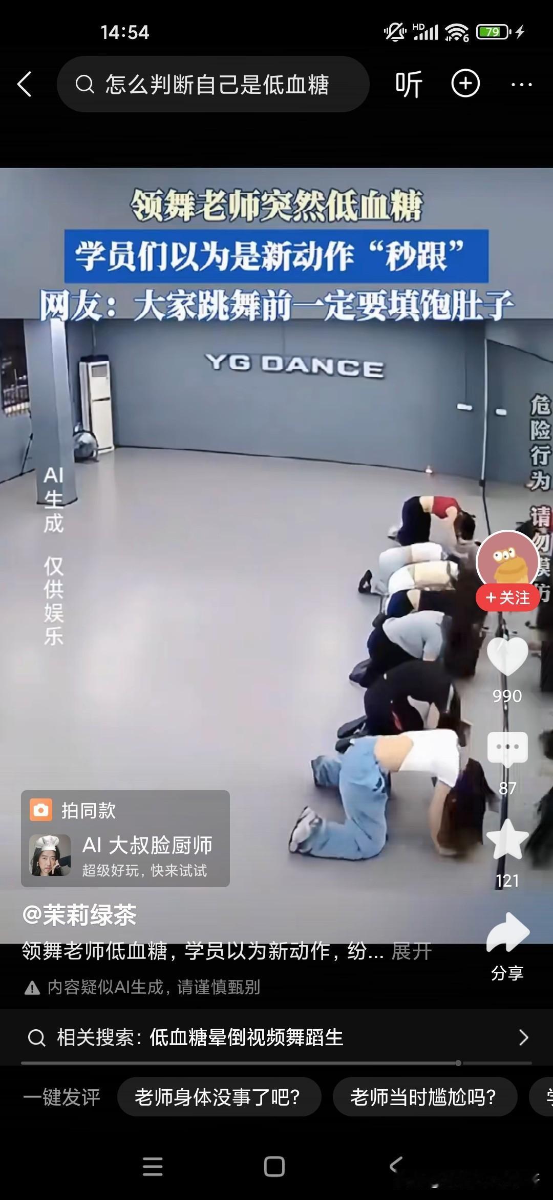 一群习舞者跟着一名领队老师一起在练舞,可能这个教舞蹈的老师早上没有吃饭,然后出现了低血糖,就出现一个向前甩头的动作往前趴了下去,其他的舞蹈学员呢以为这是舞蹈老师的新动作,然后就跟着这个教舞蹈的老师呢一起往前趴下去,直到后来这个教舞蹈的老师呢半天没有动静,最后还趴到了地上,这其他练习舞蹈的学员才开始慌张起来,原来是这个老师没有吃早餐,然后出现了低血糖,就自己倒了下去,手忙脚乱的,赶紧让她喝一些可乐或者吃块儿糖,然后才恢复的过来,因此的话,大家在运动之前的话,尽量不要空腹,尽量补充一些能量,尤其是早餐!