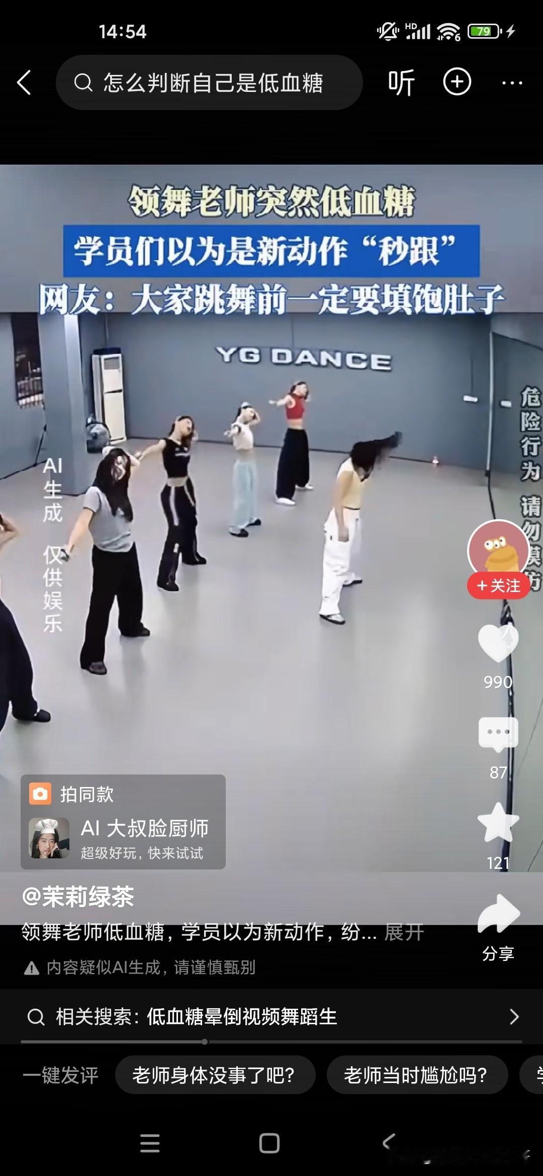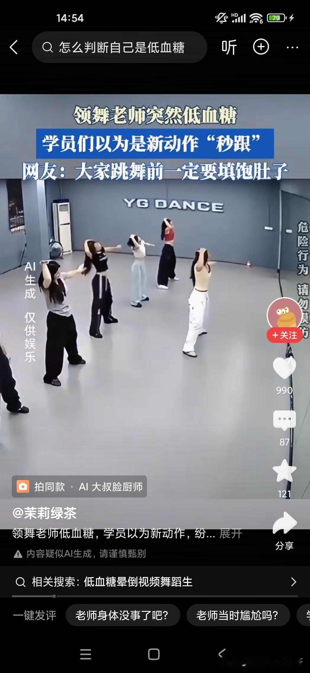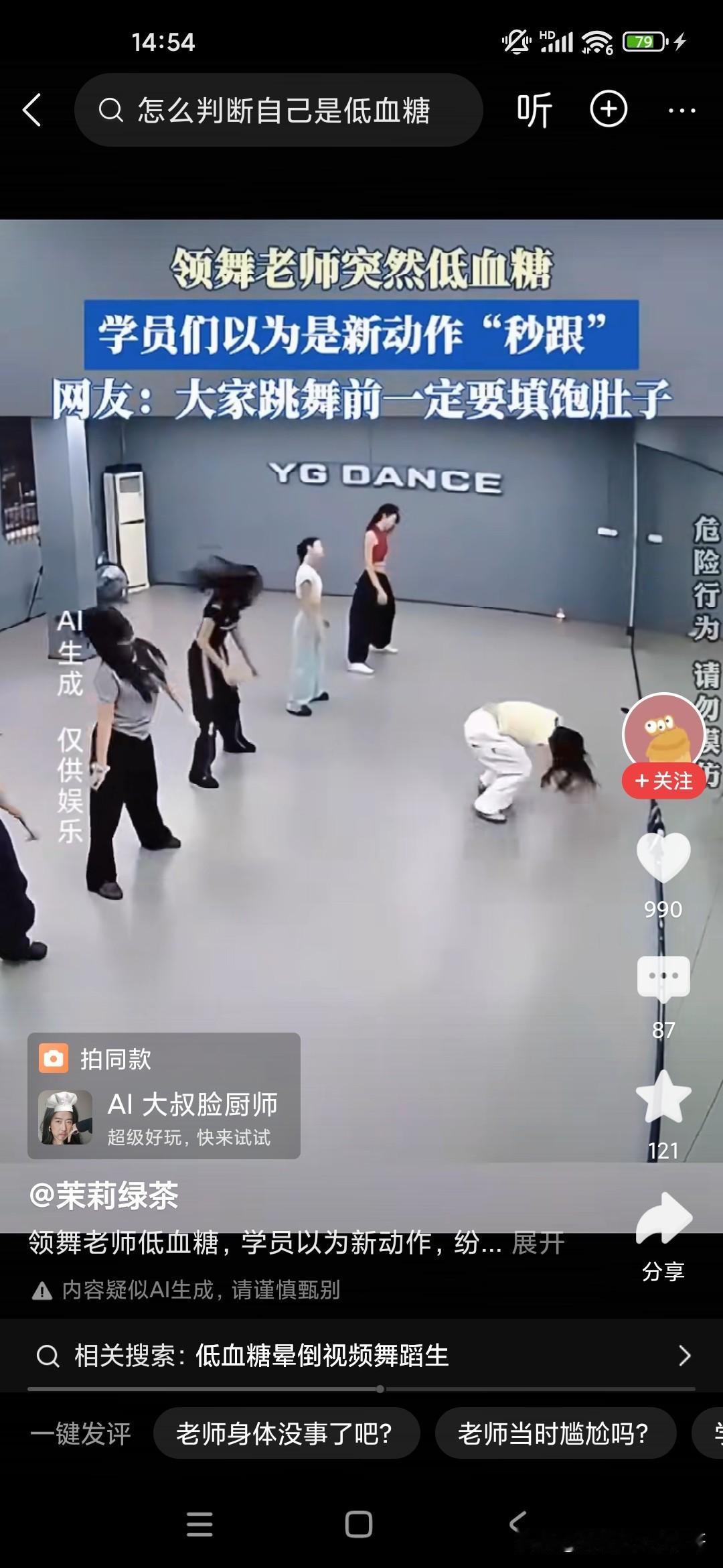 一群习舞者跟着一名领队老师一起在练舞,可能这个教舞蹈的老师早上没有吃饭,然后出现了低血糖,就出现一个向前甩头的动作往前趴了下去,其他的舞蹈学员呢以为这是舞蹈老师的新动作,然后就跟着这个教舞蹈的老师呢一起往前趴下去,直到后来这个教舞蹈的老师呢半天没有动静,最后还趴到了地上,这其他练习舞蹈的学员才开始慌张起来,原来是这个老师没有吃早餐,然后出现了低血糖,就自己倒了下去,手忙脚乱的,赶紧让她喝一些可乐或者吃块儿糖,然后才恢复的过来,因此的话,大家在运动之前的话,尽量不要空腹,尽量补充一些能量,尤其是早餐!