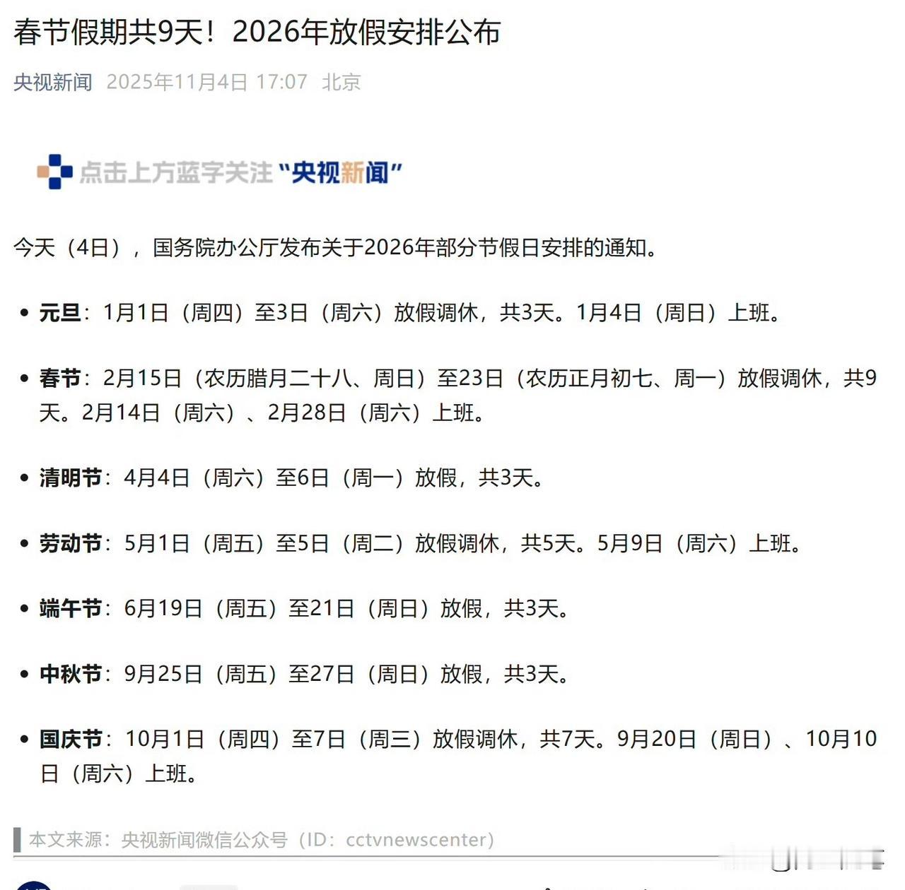 史上最长春节了吧?打工人每年最期待的也是吐槽最狠的安排,年度放假安排,总是会和调休挂钩[允悲] 话说回来,虽说是最长春节,但是工作安排也得安排好,特别是一些特殊岗位。每年都辛苦了一些坚守岗位的人,特别是为了全国人民过一个祥和平安春节的边防战士、武警官兵们,你们是最可爱的人[玫瑰][玫瑰][玫瑰][玫瑰][玫瑰][玫瑰]年底休年假 年休假制度 春节假期天数