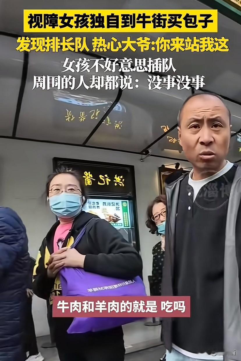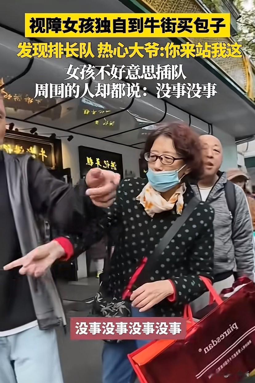 北京,失明女孩独自去买包子,店铺门前排着长长的队伍。可大伙都说:没事没事,你先买吧。一点点善意,让女孩心里暖暖的,大家伙脸上也都是笑容。 女孩眼睛失明,一点点光感都没有。她拄着拐杖到牛街逛一逛,她想去那里尝一尝可口的小吃。正在女孩过马路的时候,有一位大叔注意到了女孩。 当他看到女孩在另外一位阿姨的帮忙下安全的走过路口,他就继续往前走。女孩在路人阿姨的帮助下买了几样小吃。她听说附近有一家包子很不错,她也想尝一尝。 可是包子铺门前排着长长的队伍,她向路人询问队伍的尾巴是在左边还是右边?她也想去排队买包子。路人告诉女孩队伍尾巴在右边。 女孩听后拄着拐杖摸索着往队伍尾巴走。排队买包子的人真多,队伍也长长的,女孩走了好一会还没有到队尾。 正在女孩继续往队尾走的途中,刚才在路口就注意到女孩的那位大叔也在这队伍里。 在女孩路过他身边时,他对女孩说:妹子,刚才过马路时,我看到你了。你是要买包子吗? 女孩回大叔说是的。大叔听后就说:你别排队了。我帮你买吧?你要什么馅的包子?接着就向女孩介绍各种馅料的包子。 说完话,大叔让女孩站在自己的前面,还宽慰女孩说大家伙都能理解的。 女孩觉得插队不好,大叔却说:没事。你就站在我这。后面的几位叔叔阿姨见状纷纷对女孩说:没事没事。 可女孩依然觉得插队不好。但大叔仍然热情的坚持让女孩站在自己前面。他还向大家伙说明女孩的情况。大家听了都表示同意让女孩插队。 一位阿姨还关切的问女孩:是不是都看不见?一点光感都没有?女孩说是的。阿姨听后对女孩说:你就在那门口站着,到你了,我就告诉你。这样你就不用来回走。 大叔听后也觉得阿姨的建议挺好的,他也劝说女孩到包子铺门口站着等,这样她就不用跟着队伍走。而且大叔还贴心的牵着女孩往包子铺门口走,提醒她小心台阶。 大叔回头看自己排的队伍前面还有不少人在等着。他站在包子铺门口对正在排队的大家伙说了一下女孩的情况,征求大家伙能不能让女孩插个队先买包子? 大家伙听了大叔的话,又看看拄着拐杖的女孩,表示没有意见。听到大家伙的谦让,女孩一再感谢。 在女孩买包子的时候,大叔又贴心的帮着女孩拿包子拿袋子。女孩拿着包子离开的时候,正在排队的阿姨们又主动让出一条路。 看到前面还有长长的队伍,而且附近还有路障。一位热心的阿姨又指引着女孩走。直到走过路障,阿姨才放开女孩的手。 多好的北京人啊,善良,大气,热情。而且还不是一个人善良,是一群人同时那么善良。只要人人都献出一点善意,世界将变得更美好。
