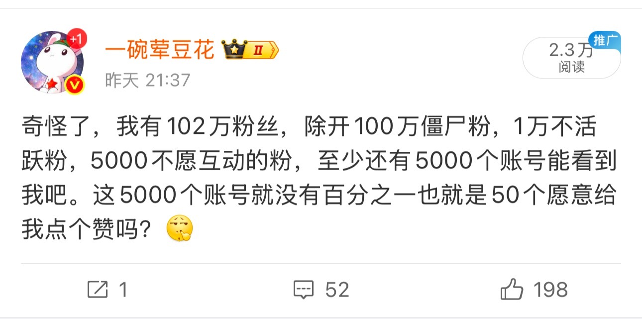 奇怪了,我有102万粉丝,除开100万僵尸粉,1万不活跃粉,5000不愿互动的粉
