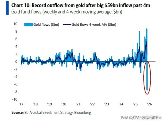 最近一周,黄金基金的资金流出创下历史最高,超过75亿美元。不过相比前四个月590亿美元的总流入,这个规模还不算大。有意思的是,之前流入的那笔钱很可能就是为现在退出准备的。