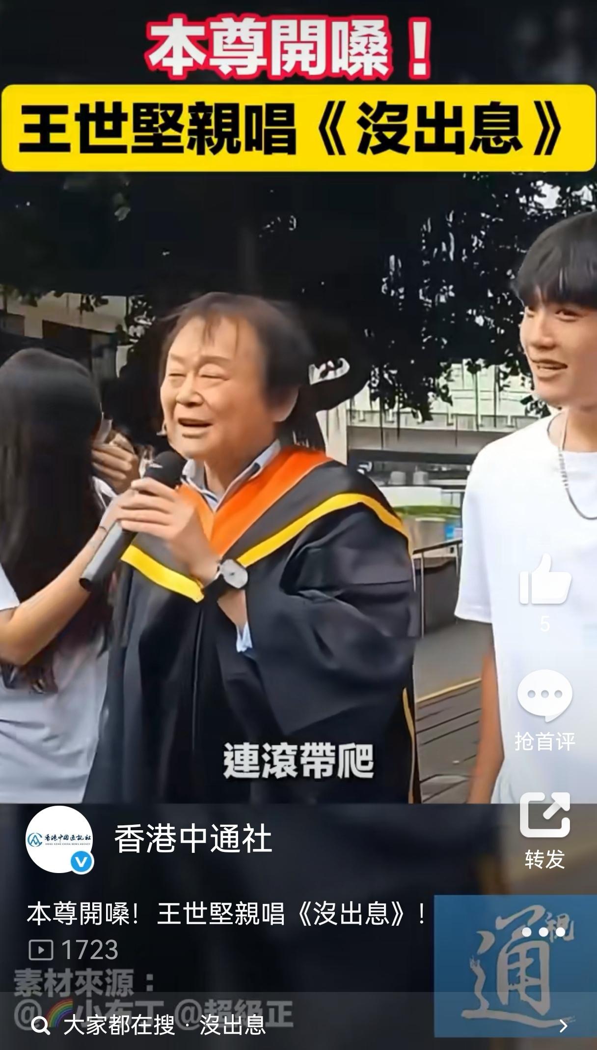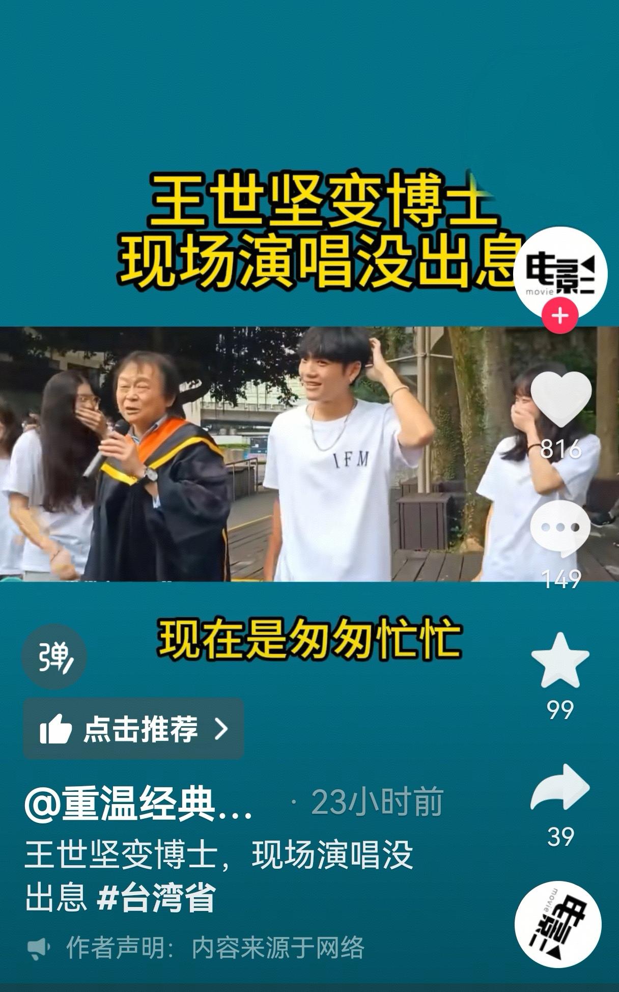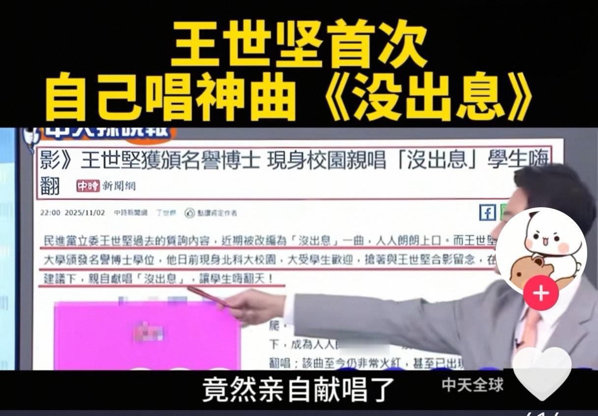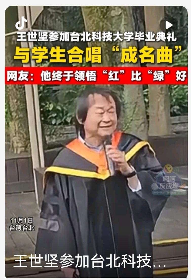 王世坚因为获得台北科技大学荣誉博士称呼,于11月1日到该校参加毕业典礼并发布感谢致辞。走下主席台的王世坚受到了学生们的追捧,纷纷要求他自己现场演唱《没出息》。王世坚和上次在记者面前的推辞不同,这次显得落落大方,拿起话筒就开唱。一开唱,音律准确,明显是练过的,所以大家建议他原地出道,告别政坛,进入歌坛,甚至有网友封他为“2025年最佳摇滚歌手”。
