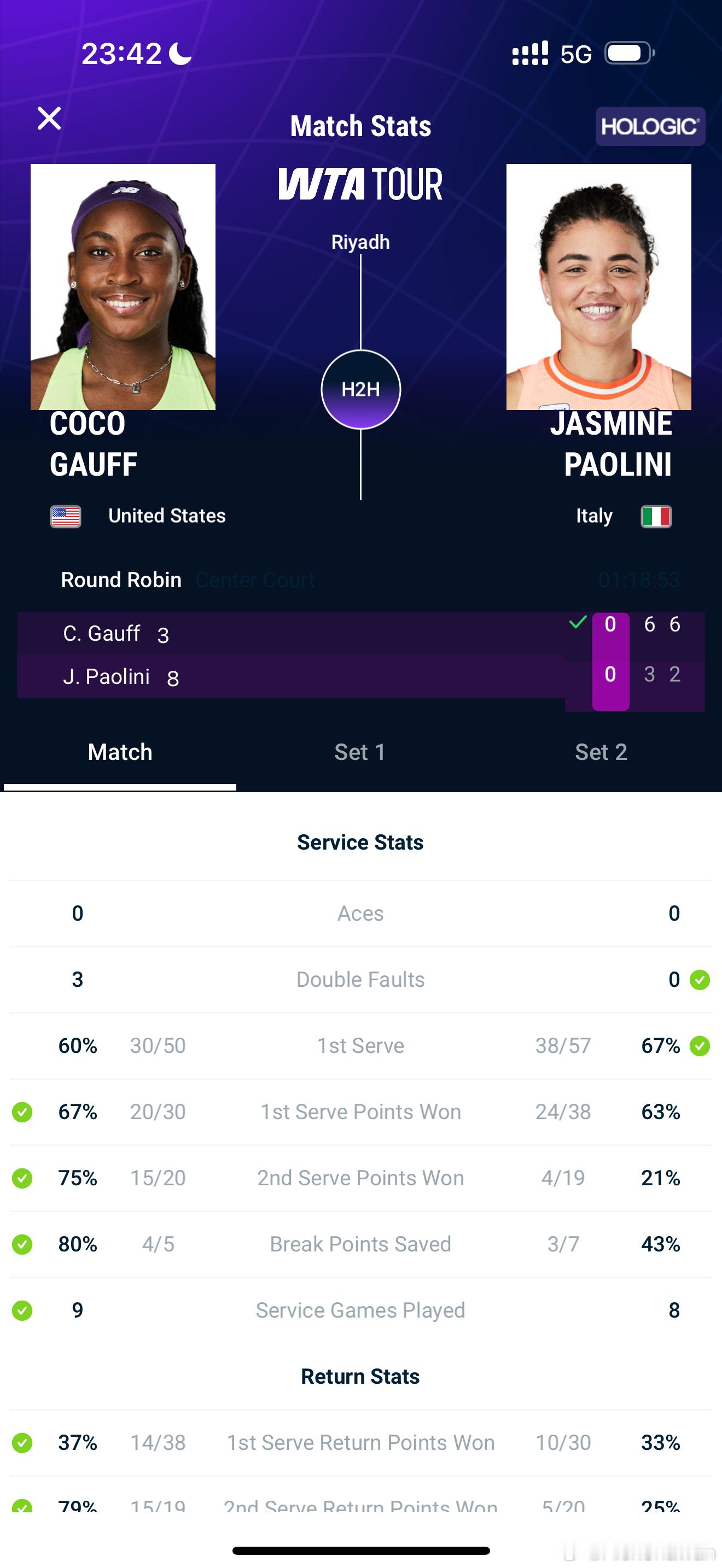 总决赛小组赛第二轮,高芙今天的双误在合理区间内,以6比3、6比2战胜鲍利尼,取得2025年总决赛小组赛首胜,保留出线悬念。