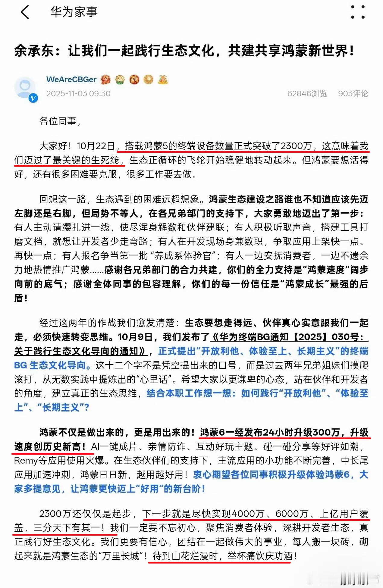 昨天余承东发表了封内部信,余总说截至目前搭载鸿蒙5的设备数已突破2300万,且鸿蒙6发布24小时,升级突破300 万,创下历史新高,目前已经算是迈过最关键的生死线了。说实话鸿蒙系统这一路走过来确实不容易,当然接下来还有很长一段路要走,我相信终有一日,鸿蒙、iOS和安卓肯定能三分天下,加油[努力]