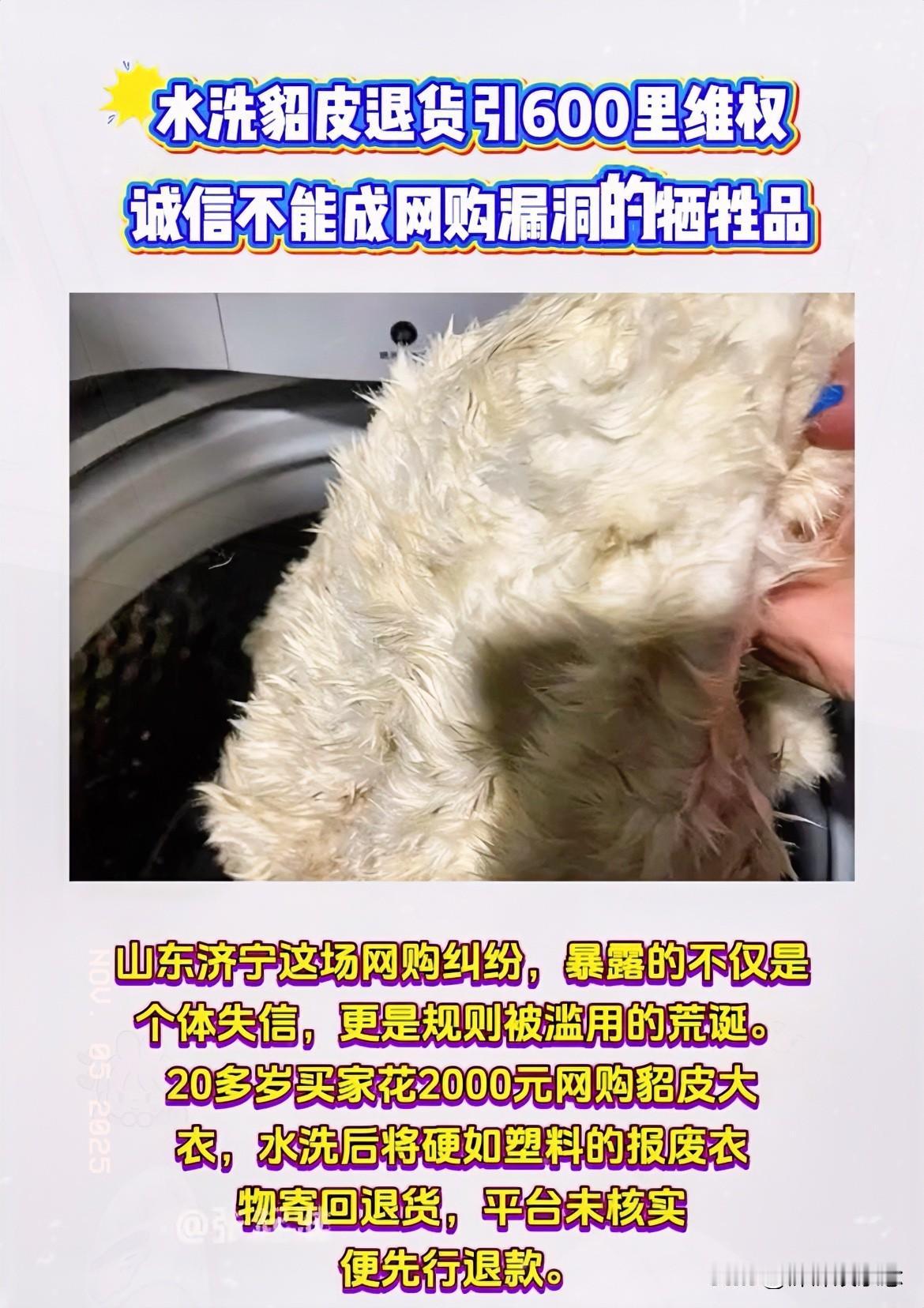 这回的貂皮大衣闹剧, 简直给全网上了一堂硬核诚信课! 卖家怒驱300公里上门维权,表面看是冲动,实则是被逼急的小商家集体发声,谁愿意当冤大头为别人的失误买单? 平台和稀泥式判罚该改改了!保护消费者≠纵容占便宜,买家水洗貂皮还退货,好比炒糊菜要退给菜市场,离了大谱!支持合理维权,但曝光隐私确实过火。 建议平台设立"失误责任险",既保护卖家血汗钱,也避免买家社死现场,诚信是金,谁砸招牌谁买单!