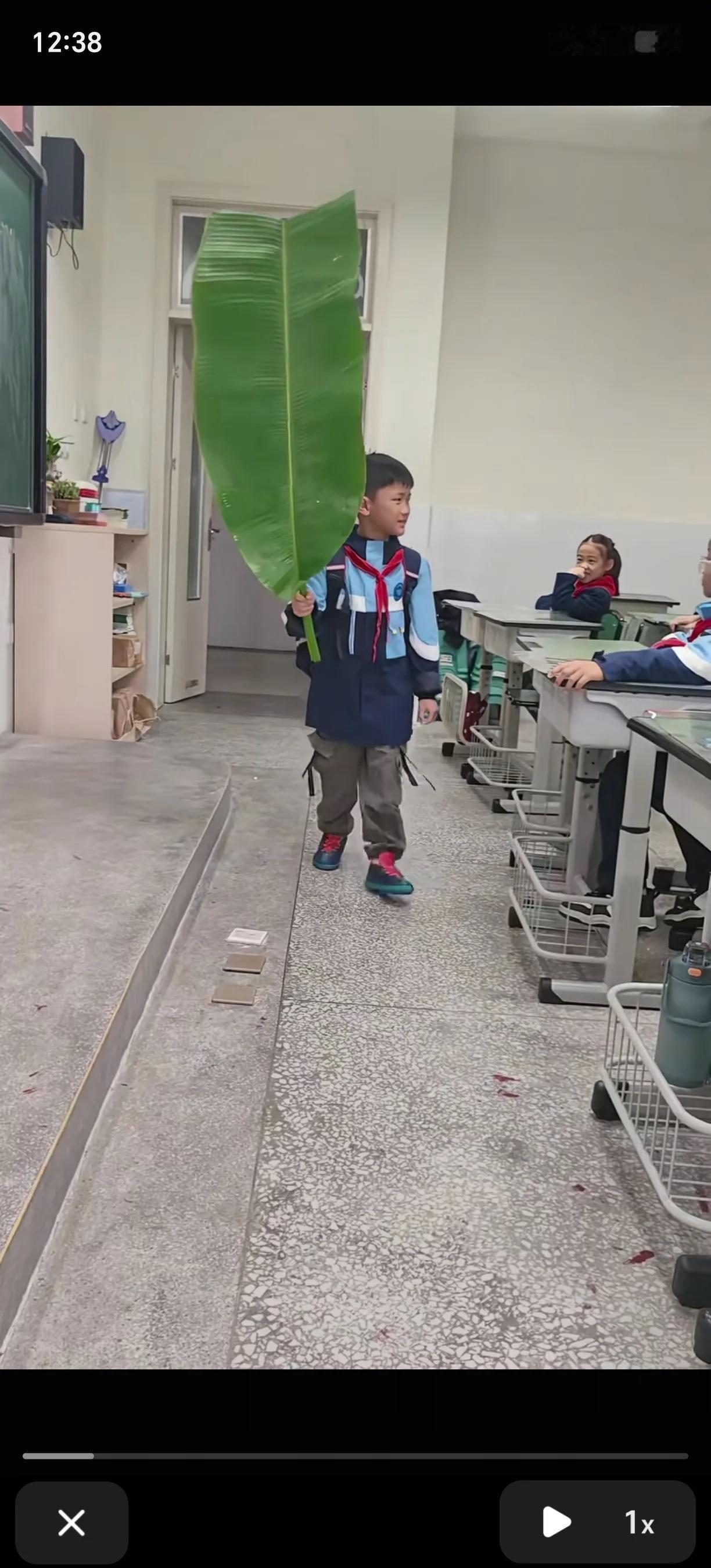 “笑不活了!”四川成都,一老师给同学安排任务,让他们自己找片叶子上课用,可没想到,一个小男孩竟然直接扛了一片“芭蕉叶”过来,把老师都看呆了。网友:“他妈妈是铁扇公主吗?” 小男孩扛着叶子进教室时,肩膀都压得往下沉。叶子太大,进门时还卡了一下,他踮着脚使劲拽,脸憋得通红,周围同学都笑出了声。 老师走过去,伸手摸了摸那片芭蕉叶,叶子比小男孩的人还宽。她忍着笑问:“你这叶子是从哪儿找的呀?咱们上课用不了这么大的。” 小男孩挠挠头,说“楼下花园里的,我觉得这片最大最好看”。说着还把叶子举起来晃了晃,风把叶子吹得哗啦响,又逗得全班同学笑起来。 有同学举手说“我只摘了小枫叶”,还有人举着银杏叶。小男孩看看别人手里的叶子,又看看自己的芭蕉叶,有点不好意思地说“我不知道要小的”。 老师笑着拍拍他的肩,说“没关系,这片叶子很特别,咱们可以用它做个小遮阳棚”。网友看到视频,纷纷评论“这孩子太实在了,任务理解满分”。