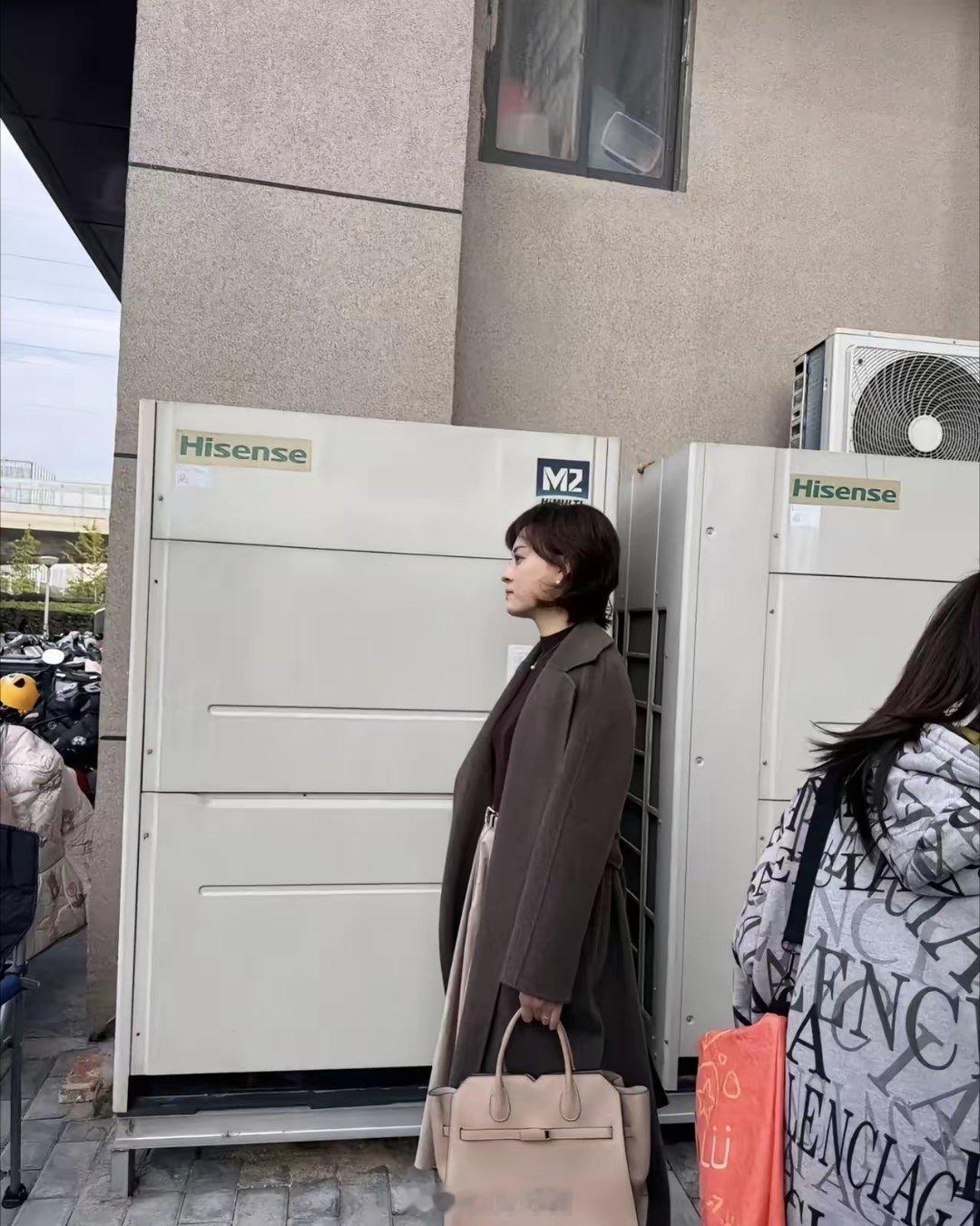 照片中,她穿着一件灰色毛呢大衣,留着一头短发,戴着珍珠耳环,打扮非常沉稳洋气,外表看起来很年轻,身材苗条,她在和工作人员交流,整个人看起来状态很棒,丝毫看不出疲态。