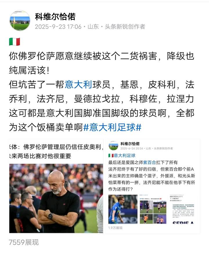 🇮🇹 佛罗伦萨纯属活该 皮奥里也是差点当上意大利国家队主帅,想想那些让它当主