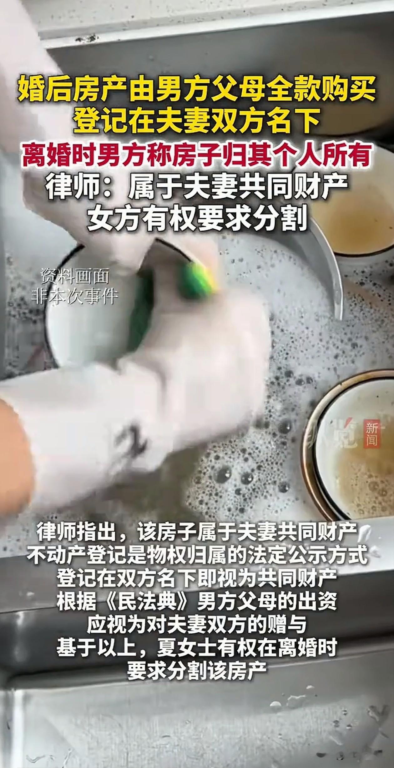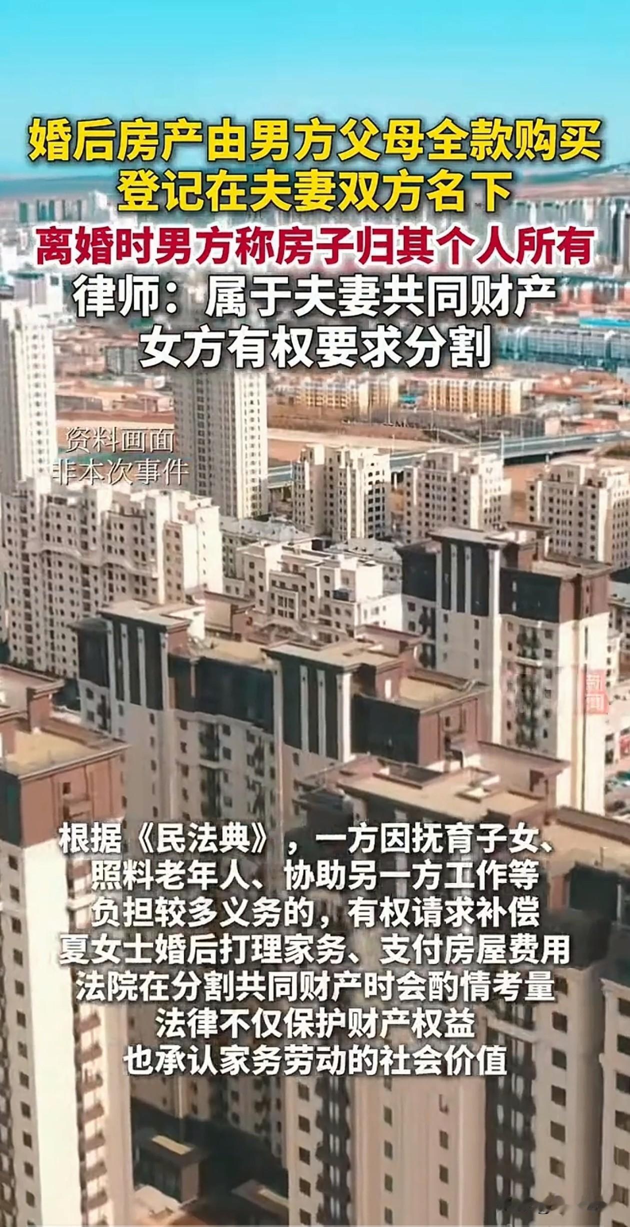 女子和丈夫结婚两年,婚后男方父母全额购买了一套婚房,房产证写的夫妻俩的名字,离婚时,女子要求分房产,被男方拒绝。 女子觉得,房子写了她的名字,而且婚后自己承担了大部分家务,还付过物业费和水电费这类房屋杂费,理应分房产。 但男方认为,房子全是自己爸妈花的钱,跟女子没关系,家务也是她应该做的,所以不能分房。 按《民法典》规定,房子登记在夫妻双方名下,没有特殊约定,就视为对两人的共同赠与,属于夫妻共同财产,女子有权分割。 同时,婚姻里承担更多家务的一方,离婚时也有权要求补偿。 男方父母是全款出资,法院会优先考虑出资方,大概率是房子归男方,但会让男方给女子补偿。补偿既包括家务劳动的价值,也包括房子作为共同财产的部分权益。 房子很难让女子平分,但她干的家务不是白干的,可以拿到一笔合理的补偿,只是金额不会和房产总价对半分。