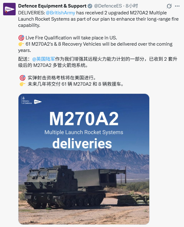 首批两辆英国版 M270A2 多管火箭发射车已抵达美国新墨西哥州的白沙导弹靶场进行首次实弹射击试验,随后将在 2026 年初 抵达英国,并装备到2个正规团(皇家炮兵第3团和皇家炮兵第26团)和1个预备役团(皇家炮兵第101团),未来几年将交付 61 辆 M270A2 和 8 辆救援车。