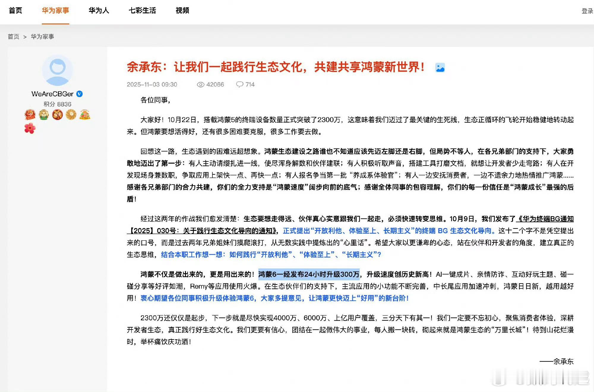 文中余总提到,截至目前搭载鸿蒙5的设备数已突破2300万,且鸿蒙6发布24小时,升级突破300 万,创下历史新高,这个成绩已经特别恐怖了,我也是首先升级体验,鸿蒙6绝对是里程碑的标志,同时我也问了身边使用鸿蒙5手机的用户,他们第一选择都是升级,从0-1难,从1到万水到渠成,鸿蒙用很短的时间走了别人几十年的路,目前已经2300万,接下来只会更强!
