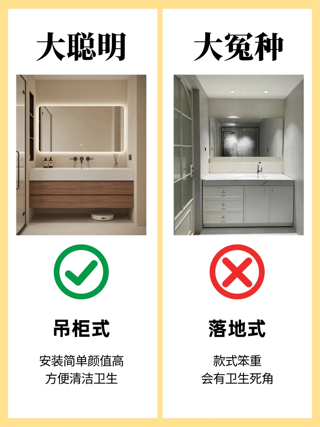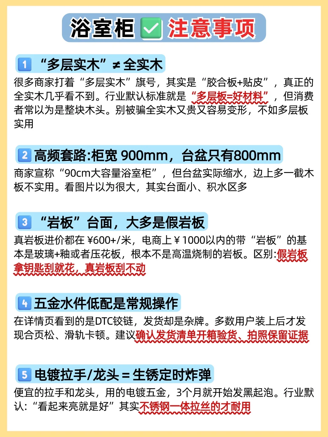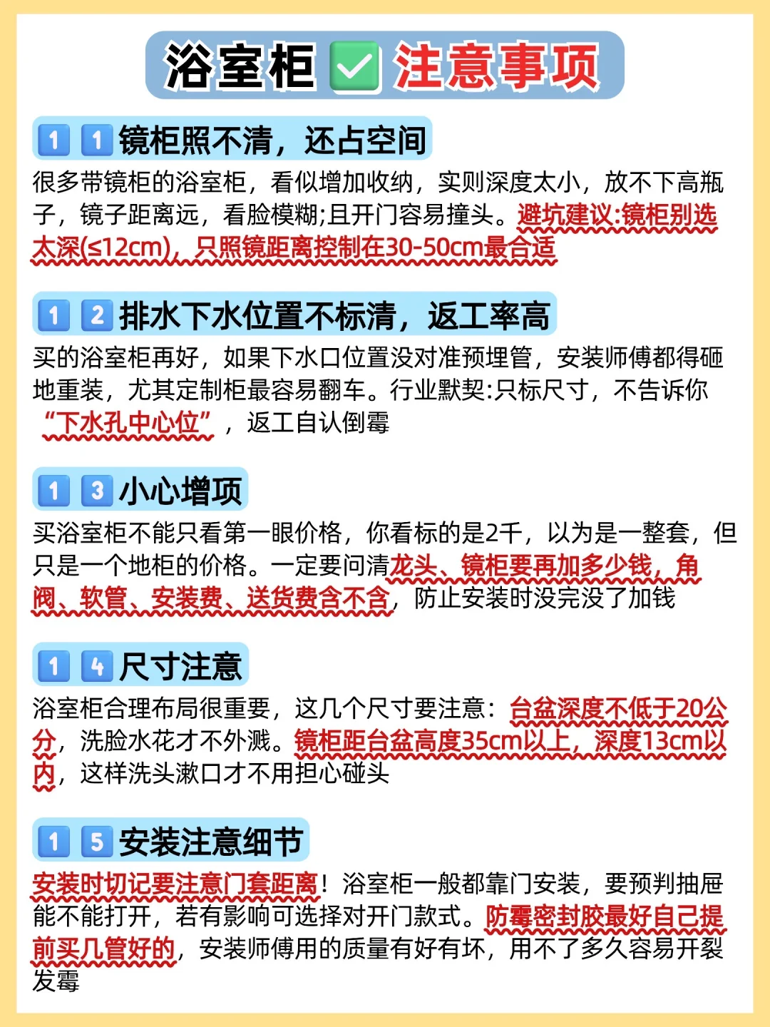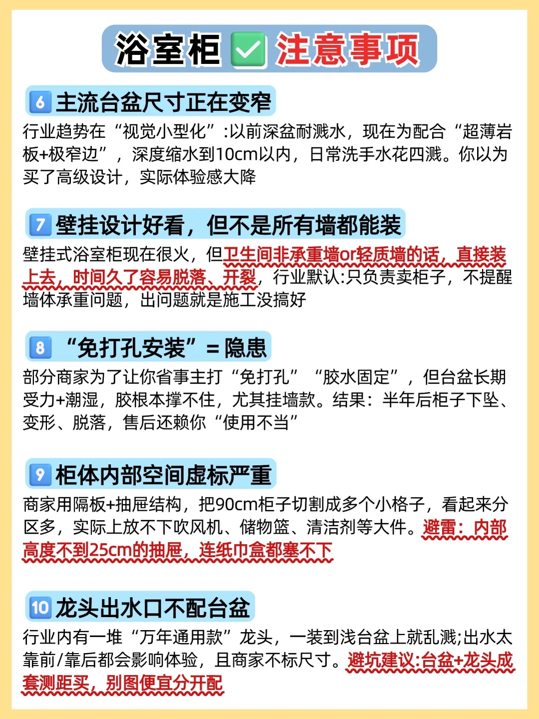 正在装修,准备买浴室柜的朋友,一篇教会大家怎么选浴室柜!10个选购重点不翻车~ 1️⃣抽拉龙头:抽拉设计使用方便,可无死角清洗水池 2️⃣镜柜设计 :储物空间大,方便收纳,可预留插座供电动牙刷充电 3️⃣智能除雾:冬季温差大镜子易起雾,一键除雾方便使用 4️⃣抽屉式/平开式:隐藏收纳美观,拿取便捷 5️⃣吊柜式:安装简单颜值高,方便清洁卫生 6️⃣陶瓷一体盆:颜值高好打扫,没有清洁死角 7️⃣免漆工艺:免漆工艺全密封防潮性强,环保好、经久耐用 8️⃣柜体实木基层:强度好不易变型,防潮性好且更环保 9️⃣优质五金配件:不锈钢一定要304,且带阻尼缓冲的 🔟墙排水:墙排水美观,打扫卫生更方便 ✅以及浴室柜选购注意事项 ⭕️“多层实木”≠ 全实木 ⭕️假岩板拿钥匙刮就花,真岩板刮不动 ⭕️五金配件建议确认发货清单开箱验货、拍照保留证据 ⭕️不锈钢一体拉丝的龙头才耐用 ⭕️壁挂式浴室柜不适合卫生间非承重墙or轻质墙,时间久了容易脱落、开裂 ⭕️避雷柜子内部高度不到25cm的抽屉,连纸巾盒都塞不下 ⭕️台盆+龙头成套测距买,别图便宜分开配 ⭕️镜柜别选太深(≤12cm),只照镜距离控制在30-50cm最合适 ⭕️台盆深度不低于20公分,洗脸水花才不外溅 ⭕️镜柜距台盆高度35cm以上,深度13cm以内,这样洗头漱口才不用担心碰头 ⭕️安装浴室柜切记要注意门套距离! ⭕️防霉密封胶自己提前买几管质量好的防霉的