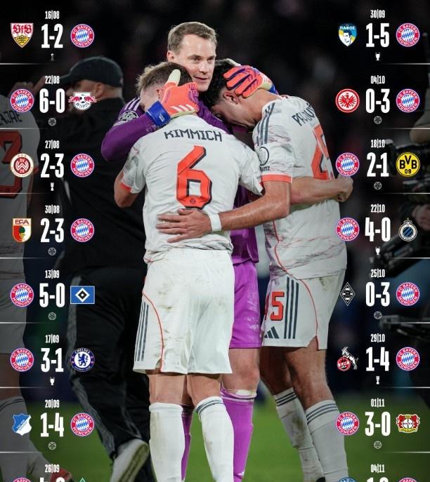 十六连胜、刷新历史 随着德甲班霸拜仁慕尼黑在客场2-1战胜大巴黎,拜仁新赛季取得16连胜的最佳开局,继续刷新由自己创造的记录! 本赛季的拜仁慕尼黑,16连胜的含金量非常之高,其中6-0血洗德甲第二莱比锡红牛、2-1德甲第三多特蒙德、2-1德甲第四斯图加特、3-0德甲第五勒沃库森、4-1德甲第六霍芬海姆、4-1德甲第七科隆、3-0德甲第八法兰克福、4-0德甲第九不莱梅,德甲排名在上半区的球队都被拜仁杀了一个遍! 在欧冠赛场,拜仁慕尼黑同样不遑多让,3-1战胜世俱杯冠军、英超第七切尔西,2-1力克新科欧冠冠军、法甲第一巴黎圣日耳曼,以四连胜排名第一! 拜仁慕尼黑在这16连胜期间,攻防两端表现都非常出色,进攻端打进56球火力全开,防守端仅丢11球,有13场比赛可以至少打进3球,非常凶残!