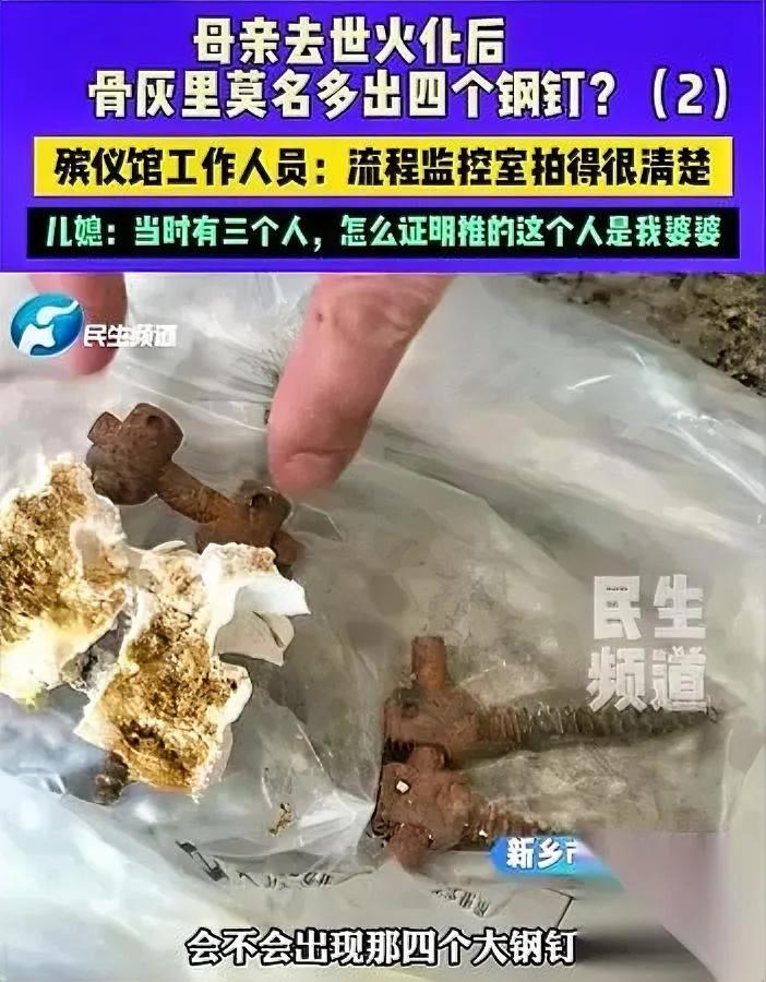 河南新乡这事,太堵心了 母亲走后火化 骨灰里居然翻出四个钢钉? 儿媳红着眼眶说,我妈活了60多年,连阑尾手术都没做过,钢钉哪来的?殡仪馆说监控拍得清楚流程,可她越想越慌——当时火化间推了三个人进去,凭啥确定那具就是我婆婆? 最让人难受的是这份“不踏实”:亲人最后的一程,本该是“确定”的告别,现在倒好,“是不是她”成了问号,钢钉像根细针,扎在心里拔不出来。不是要闹,就是想求个“清楚”:我妈最后走的,到底是不是“自己的路”? 换作是你,遇到这种事能不慌吗?你觉得该先盯着监控里的“身份确认细节”,还是赶紧找第三方做鉴定?评论区聊聊,帮这家人出出主意——毕竟,有些“明白”,比什么都重要。
