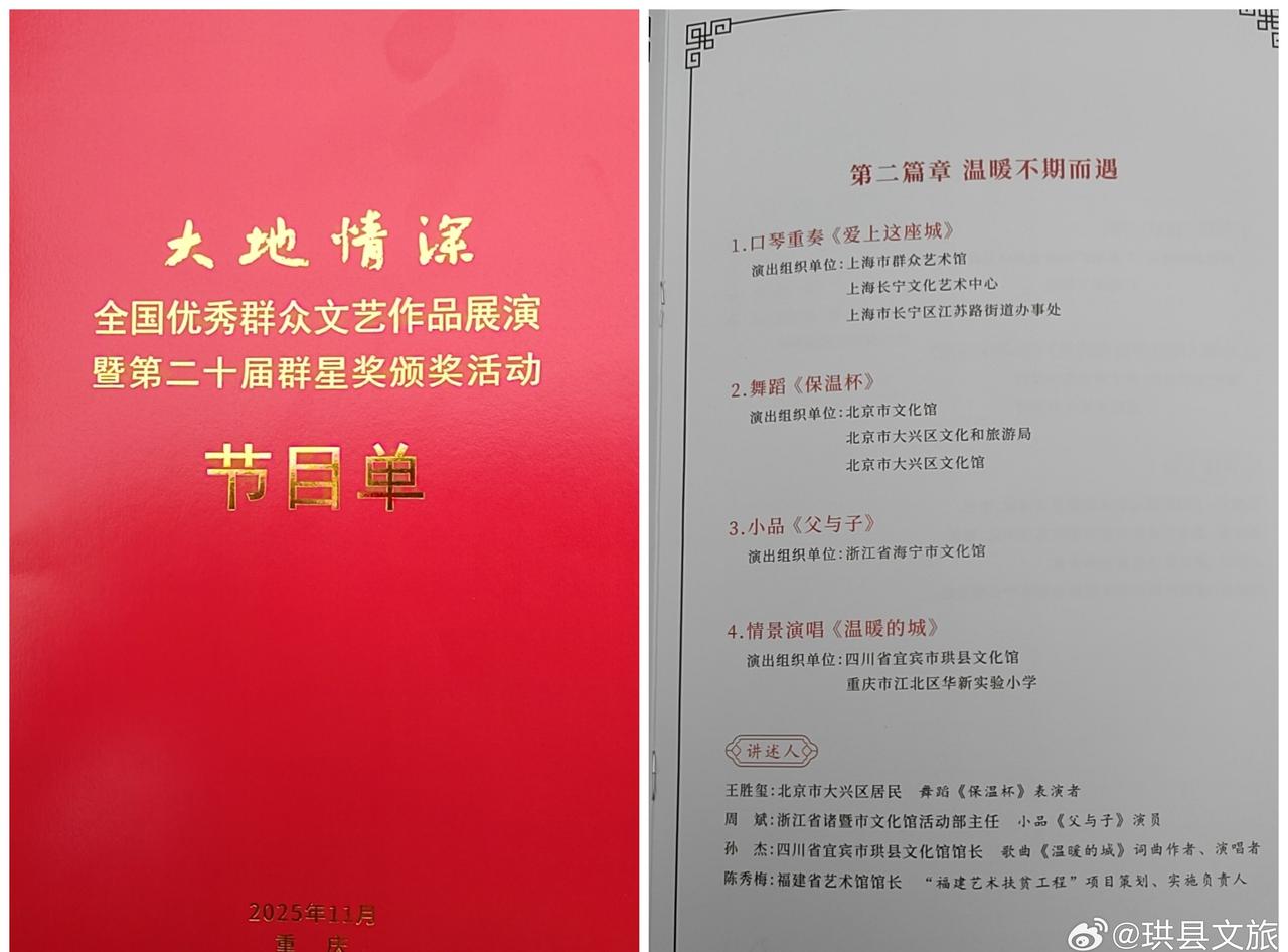【全国瞩目!珙县原创《温暖的城》登群星奖舞台,让巴蜀温度唱响重庆】 11月4日下午,重庆群星剧院灯火璀璨,全国群众文艺目光尽数聚焦——全国优秀群众文艺作品展演 暨第二十届群星奖颁奖活动正式启幕!珙县原创情景演唱《温暖的城》作为四川代表登台,以“多个群体”串联宜宾城温暖故事,体现城市温度,旋律轻暖如诉。这颗扎根生活的文艺星火,在全国群众文艺最高舞台上,绽放出巴蜀大地的人心温度与时代光彩。网页链接