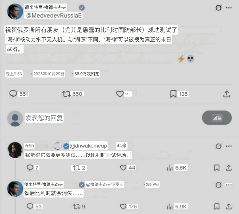 到底谁“疯了”?梅德韦杰夫威胁要对比利时北约总部所在地布鲁塞尔进行核打击。 比利时国防部长表示,如果普京攻击北约,北约将摧毁莫斯科。梅德韦杰夫决定以末日威胁作为回应。“那么比利时就会消失”他回复一位建议在比利时测试“波塞冬”的粉丝时说道。 2025年10月29日,普京宣布俄罗斯成功测试了核动力无人水下航行器“波塞冬”,这是一种携带核弹头的战略武器系统,设计用于攻击沿海城市,能引发放射性海啸。普京称其为“巨大成功”,强调该系统“不可能被拦截”,并将其描述为俄罗斯最先进的核威慑工具之一,威力远超“萨尔马特”洲际导弹。 测试结果由俄罗斯国防部确认,包括从母潜艇发射和核动力装置启动的完整过程。 在10月28日,比利时国防部长西奥·弗兰肯接受《De Morgen》采访时表示,如果俄罗斯总统普京使用核武器攻击北约成员国,特别是比利时首都布鲁塞尔北约总部所在地,北约将以摧毁莫斯科作为回应。 弗兰肯说:“普京知道,如果他使用核武器,莫斯科将被从地球上抹去。”这一声明被视为对俄罗斯核威胁的直接反击,重申北约的集体防御原则第五条款。弗兰肯的言论迅速在欧洲媒体传播,引发俄罗斯方面的激烈反弹。 俄罗斯前总统梅德韦杰夫迅速回应,他首先发帖祝贺“波塞冬”测试成功,并特别点名弗兰肯:“祝贺俄罗斯的所有朋友,尤其是比利时国防部那个愚蠢的部长,成功测试了带有核动力装置的‘波塞冬’无人水下航行器。与‘暴风雪’不同,‘波塞冬’可以被视为真正的末日武器。” 随后,他的一位俄罗斯品客粉丝在梅德韦杰夫的帖子下评论,建议将比利时作为“波塞冬”进一步测试的地点,以回应弗兰肯的威胁。梅德韦杰夫回复道:“那么比利时就会消失。”这一回复被广泛解读为核打击威胁,迅速在全球社交媒体传播。 梅德韦杰夫的言论符合他近年来一贯的“过量饮用伏特加醉鬼”风格,他经常发布挑衅性内容,针对西方国家发出核威胁。此前,他曾威胁对美国、英国和德国使用核武器,特别是此次直接点名比利时。问题在于,他从不用为他的言论负责,而西方面对威胁都是认真的。 美国前驻乌克兰大使斯蒂芬·派弗回应称,梅德韦杰夫低估了“波塞冬”使用可能引发的连锁反应——这将消除对俄罗斯城市的核打击顾虑。 欧盟和北约尚未正式回应,但比利时警方已调查多起针对军事基地的无人机事件,可能与俄罗斯相关。欧洲媒体《莫斯科时报》将梅德韦杰夫描述为“克里姆林宫的小丑”,其言论旨在制造恐慌而非实际政策。 俄罗斯未直接评论梅德韦杰夫的个人帖子,但普京的测试宣布强化了俄罗斯的核威慑叙事。亲俄媒体如Pravda将弗兰肯的声明斥为“疯了”,并赞扬梅德韦杰夫的“幽默回应”。 这一事件加剧了俄乌冲突的核阴影。相关话题如迅速登上全球社交平台热搜,包括西班牙语和葡萄牙语的翻译版本,如“我们应该把比利时变成‘波塞冬’核试验场;然后这个国家就会消失”。 分析人士担忧,这可能刺激特朗普政府加强欧洲部署核潜艇,作为对俄威慑。 此事件反映了俄军人和西方在核门槛上的相互试探,比利时国防部长弗兰肯的声明属于防御性回应,而梅德韦杰夫的威胁则是宣传性升级。到底谁“疯了”?