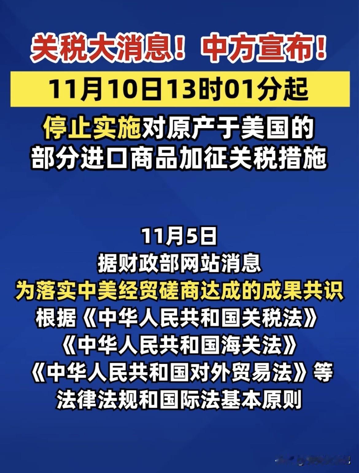 2025年11月5日消息,国务院关税税则委员会发公告,自11月10日13时01分起,停止对原产于美国的部分进口商品加征关税。这是落实中美经贸磋商成果共识的举措,依据了《中华人民共和国关税法》等法律法规和国际法基本原则。 中美双方停止实施部分双边加征关税,是互利之举。既符合两国和两国人民的根本利益,也顺应了国际社会的期待。这一决策有助于推动双边经贸关系迈向新高度,给两国的贸易往来注入新活力,说不定以后咱能买到更多实惠的美国商品呢。
