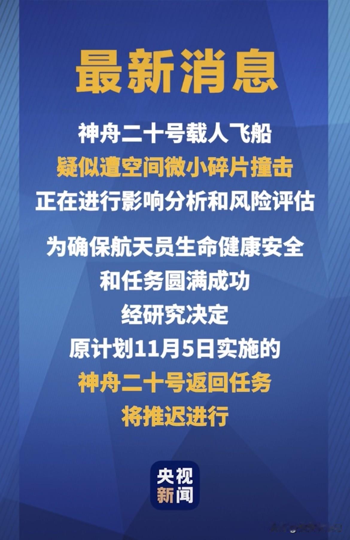 2025年11月5日这事儿可太让人揪心了。原计划这天返回地球的神舟二十号载人飞船,疑似遭空间微小碎片撞击,返回任务紧急推迟。 神舟二十号是4月24日发射的,航天员陈冬、陈中瑞、王杰在轨都超190天了,之前已完成全部既定任务,11月4日还和神舟二十一号乘组完成了空间站交接。本来大家都盼着他们回家,这下出了这么个状况。不过咱航天人肯定会做好影响分析和风险评估,把航天员的生命健康安全放首位。相信后续能顺利解决问题,让航天员平安归来!