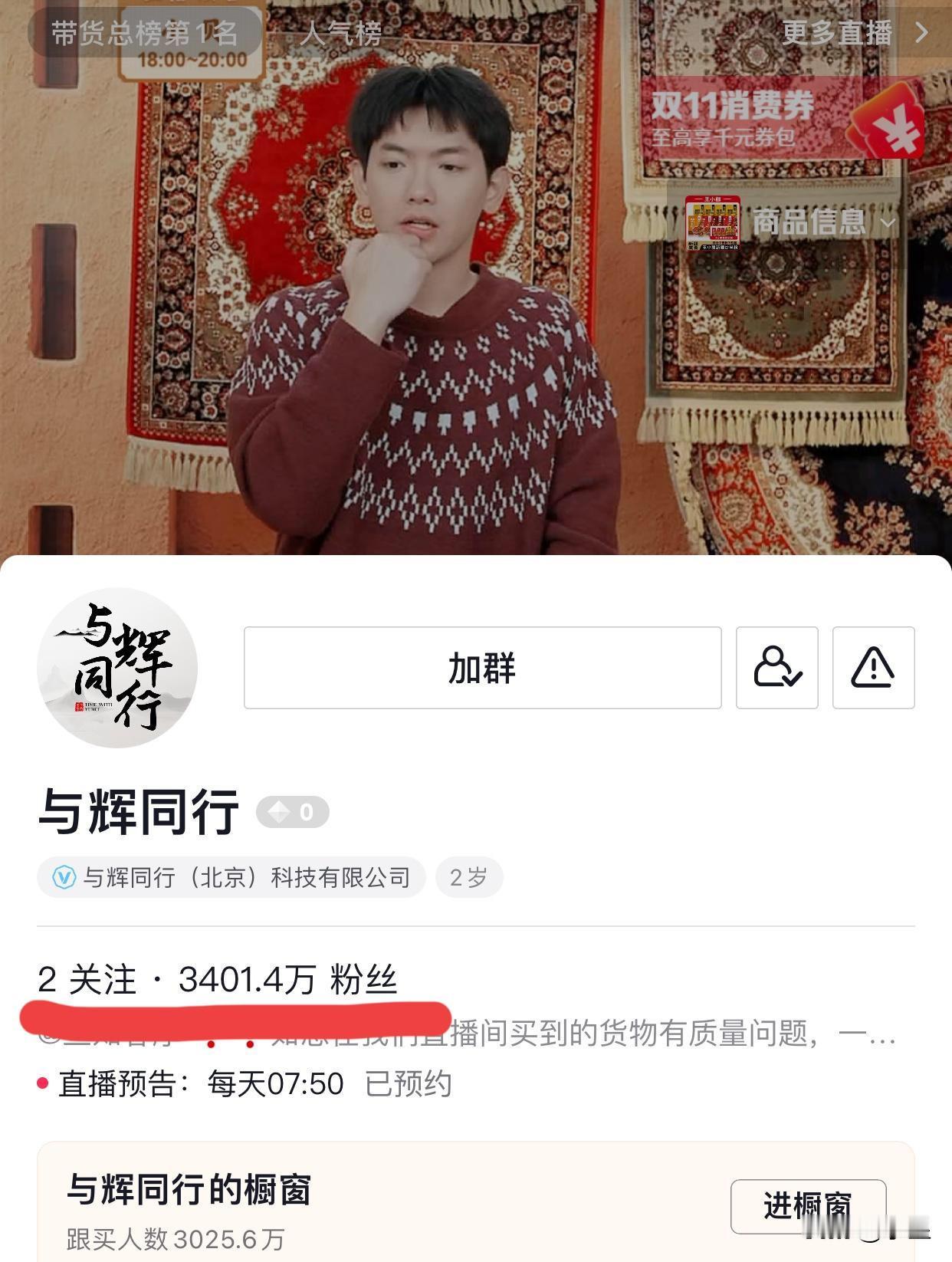 今天与辉同行新疆特产返场 又卖爆了!直播间里那叫一个热闹 一大早在线人数就10万+到下午18点 一直维持在5、6万人上下 稳居抖音带货榜第一 很多爆品都秒没 还有一些产品已经是7天预售了 大家对新疆特产的热情不减啊 还有一些消费者下午才知道返场 跑去直播间找主播要 但确实没有了,只能等下次返场[笑哭] 一不留神与辉同行的粉丝已经3400万了 10月17日才庆祝过突破3300万 这才过了18天又涨了100万粉丝 要知道带货的直播间这么涨粉 可是难上加难的,这速度简直势如破竹 按照这火爆程度要破4000万也指日可待 目前看来已经没有人能阻挡得了 董宇辉的发展步伐 加油吧彪哥,大刀阔斧向前冲[耶]