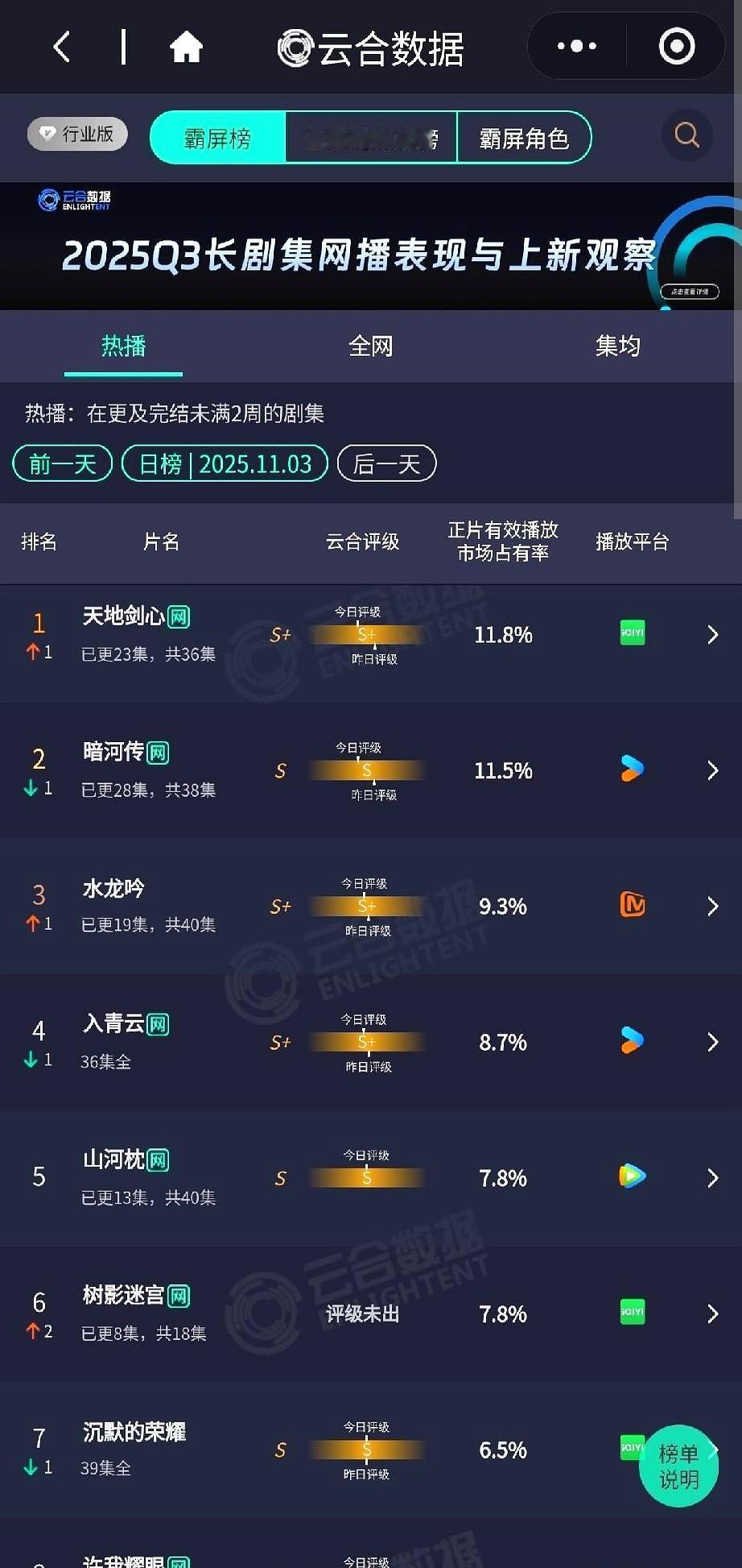 武侠不挣钱?爱奇艺一部剧把老观众全拉回沙发 11月3日云合榜单把《天地剑心》推到第一,11.8%的市占率看着像冷冰数字,背后却是平台敢砸钱请张黎、请沧月、请陈晓李一桐,因为他们算准了:35岁以上观众兜里有钱,只是缺一部不把他们当傻子的剧。 武侠份额涨23%,不是情怀突然值钱,是制作方把打戏拍回地面,把台词写成人话,让熬夜加班的人晚上能听一句“侠义仍在”。 爱奇艺赌赢,腾讯优酷马上加排档,三家抢同一批观众,好处是更新更快,坏处是烂尾风险翻倍。 我追了23集,最感动的是男主受伤真的躺了半集,没有第二天就生龙活虎,这份尊重让会员费显得值。 武侠回春不是奇迹,是有人愿意慢下来把故事讲圆,观众就用遥控器投票。 老伙伴们,别舍不得那点流量,点开看看,咱们年轻时的江湖还在,只是换了个马甲。