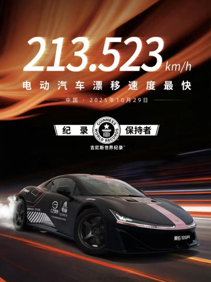 10 月 29 日,广汽昊铂旗下纯电超跑昊铂 SSR 刷新了纯电车漂移最高时速吉尼斯世界纪录。