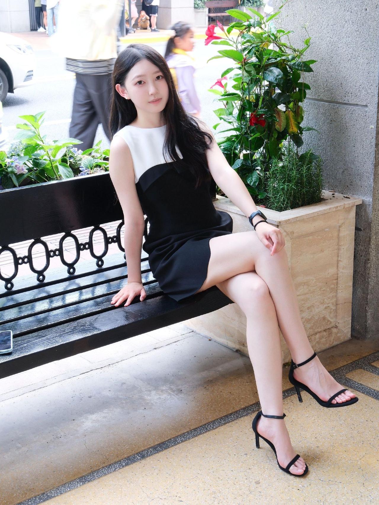一件黑白拼接的无袖连衣裙,搭配黑色高跟凉 鞋,简约又时尚。