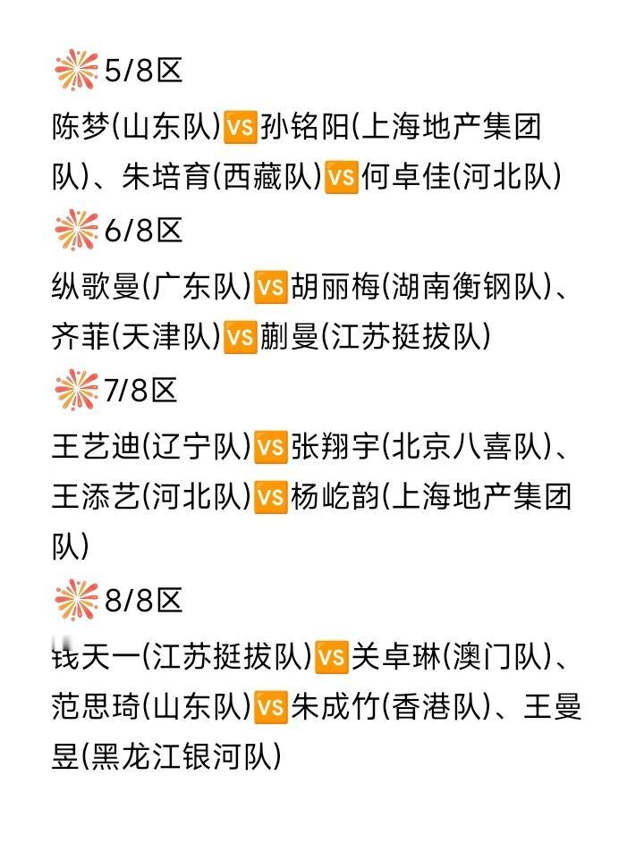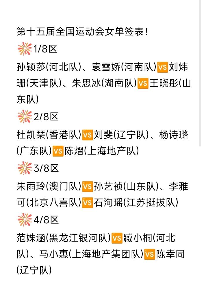 河北队孙颖莎在上半区! 山东队陈梦在下半区! 王曼昱、蒯曼也在下半区! 第15届全国运动会女单签表发布,上半区除了孙颖莎外,高手就是朱雨玲和陈幸同了。 相比较来说,世界排名前五位的有三个都在下半区,再加上一个奥运冠军陈梦,下半区高手还是比较多了。 全运会真的是热闹啊[捂脸]。