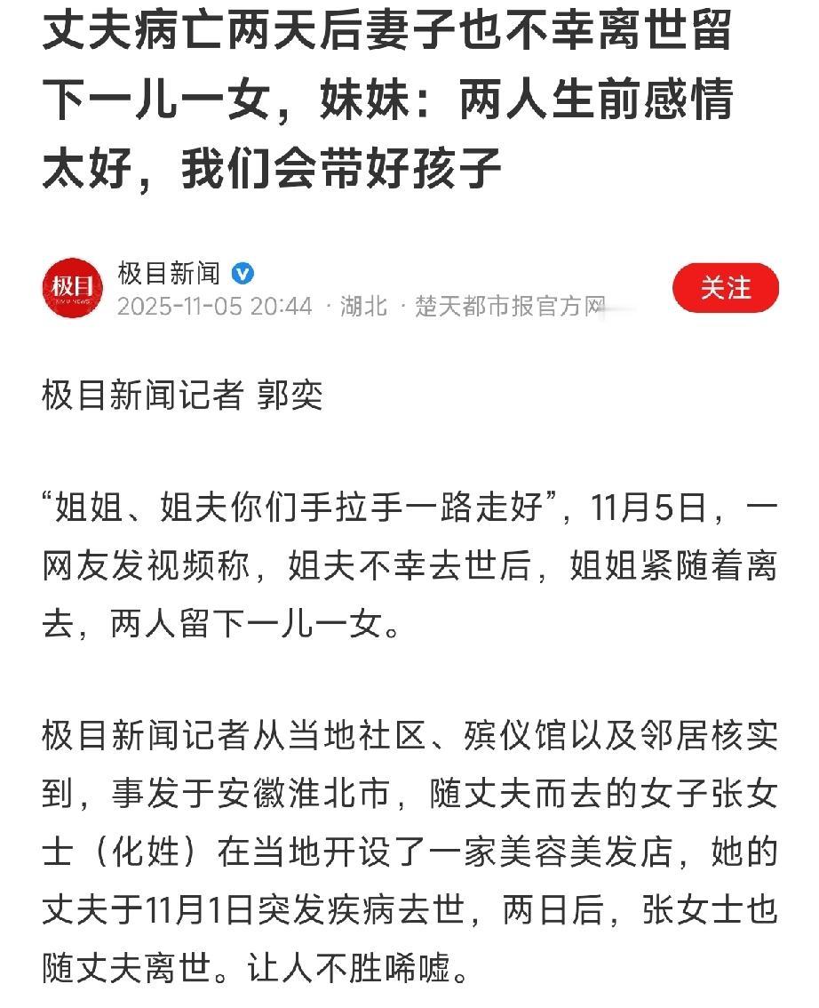 丈夫刚走两天妻子突然离世,妹妹含泪道破真相:他们感情太深了! 这事儿听着就让人心里发沉。安徽淮北一对夫妻,前后脚离世,就隔了两天。 丈夫11月1号突发疾病走了,才52岁。谁承想,11月3号,妻子张女士也因突发情况没救回来。 社区的人直叹气,“她接受不了啊。”留下的两个孩子,女儿还在上大学,儿子才十几岁,一下成了孤儿。 翻翻张女士生前的社交账号,全是幸福点滴。最后一条视频里,一家四口紧紧依偎;置顶的是她和老公牵手跳舞,庆祝结婚18周年。邻居都说,这一家子原本美满得很。 妹妹站出来澄清,话里带着泪:“别乱猜,我姐和姐夫感情实在太好。”她说家人会照顾好两个孩子。 感情深到愿意生死相随,这份执着让人动容,更留下沉甸甸的思考。日子总得向前,希望两个孩子能在亲人的爱护下,带着这份深厚的爱,勇敢走下去。