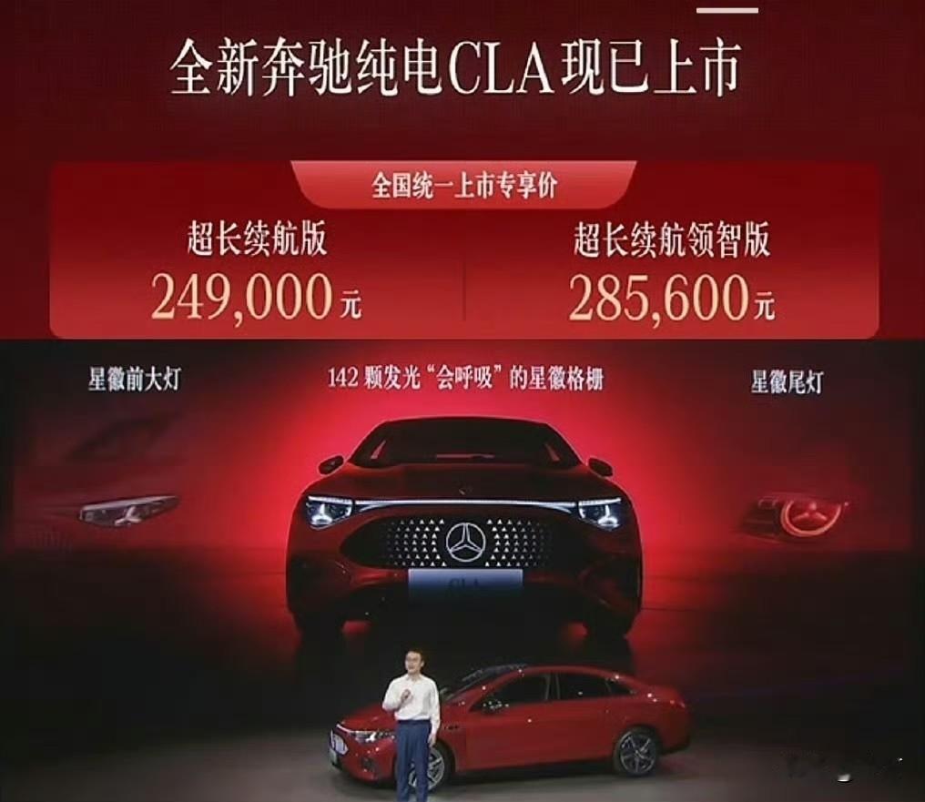 不到25万的电动奔驰来了! 今天晚上很多人都在等这个车的价格,尤其是很多同行都在盯着,毕竟奔驰和其他品牌不一样! 所以当他用24.9 万来敲击我们这边市场的时候,不知道我们国产这么多品牌,看到这个价格心里面是落地了,还是提到嗓子眼了,还是淡定的无所谓。 因为他这两个版本,一个相当于25万,另外一个就相当于是30万了,可以说奔驰本身这个品牌的分量还是挺大的! 从配置方面来看,他用的是89度电,一口气可以干到866km,而仅仅是凭这几点,好像与我们国产新能源汽车,不能形成根本的撼动力! 毕竟我们拿手好戏,是辅助驾驶,但是大家也不要掉以轻心,因为他前面这么大一个logo,比我们大多数国产车知名度都要高,这是一个不用争的事实。 现在谁都不知道 ,这款车在接下来几个月的表现怎么样,而且他主题还是搞得红色,马上就要年头年尾了,这个颜色刚好比较讨喜,所以还真的说不好! 但是现在我们大多数人,已经开始袪魅了,对这个标志的敏感度不是那么高了,对豪华的认可也不是用标志来定义了,此一时彼一时,风水轮流转的时候,你觉得这个车在接下来的几个月,这车能掀起多大的浪花?