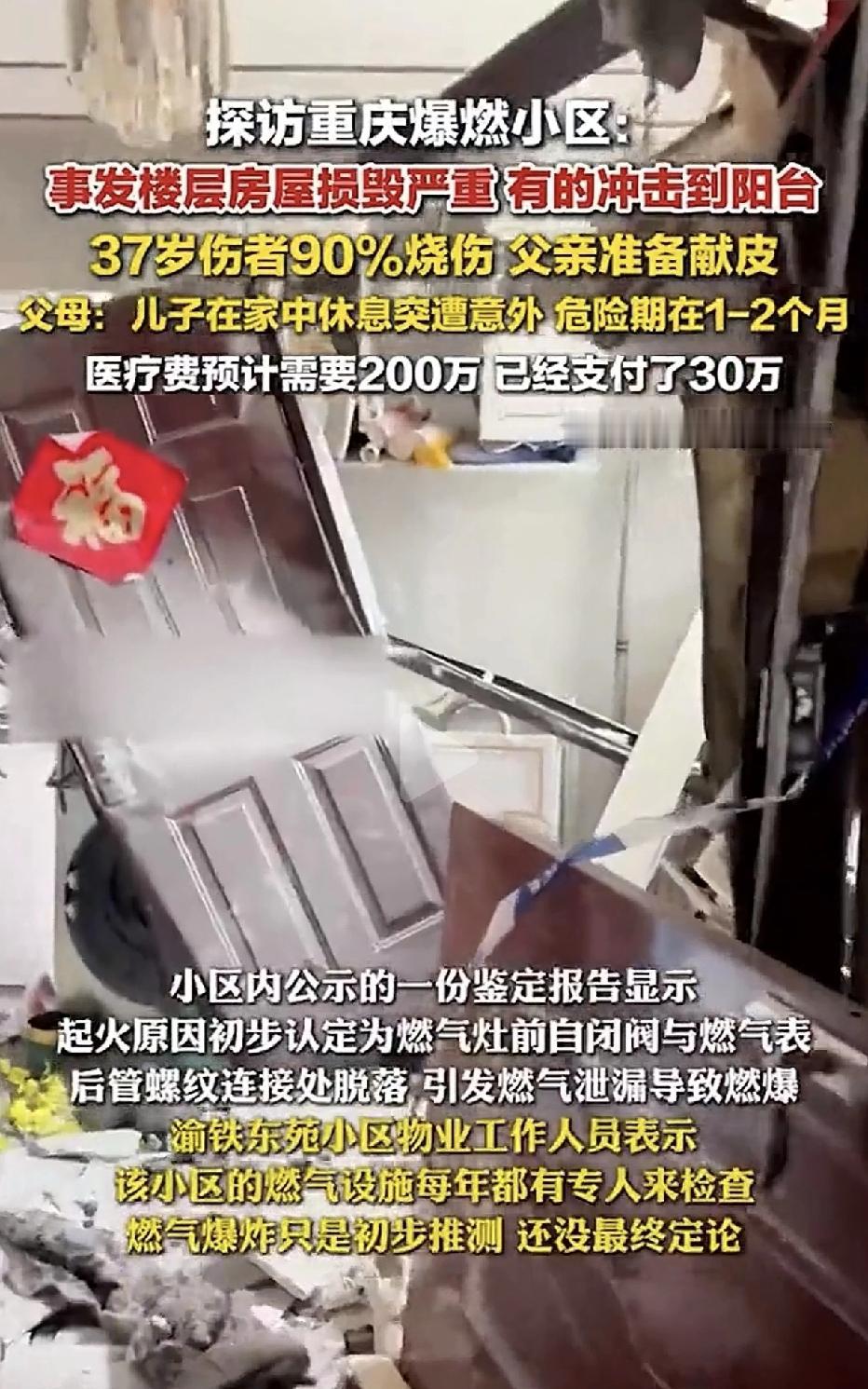 秋冬季节一定要注意燃气安全,重庆渝铁东苑小区一居民家中发生爆炸,阳台窗户被炸飞,火焰从窗户窜出,现场浓烟弥漫 。 37岁的业主刘诚(化名)在家中休息时遭遇意外,全身烧伤面积超90%,被紧急送往陆军军医大学西南医院抢救,至今仍未脱离一至两个月的危险期。刘诚的父亲已经入院,准备为儿子献皮,刘诚的治疗费用预计需200万元,目前已花费的30多万元,是家人向亲友借来的,再加上网络募捐与小区业主的自发捐款,邻里的善意,成为这场意外中最温暖的光。 目前,事故初步认定为“燃气灶前自闭阀与燃气表后管螺纹连接处脱落引发燃气泄漏”,但各方仍在等待最终调查结果。这场事故不仅是一个家庭的劫难,更敲响了燃气安全的警钟。(图片来源于网络侵删)